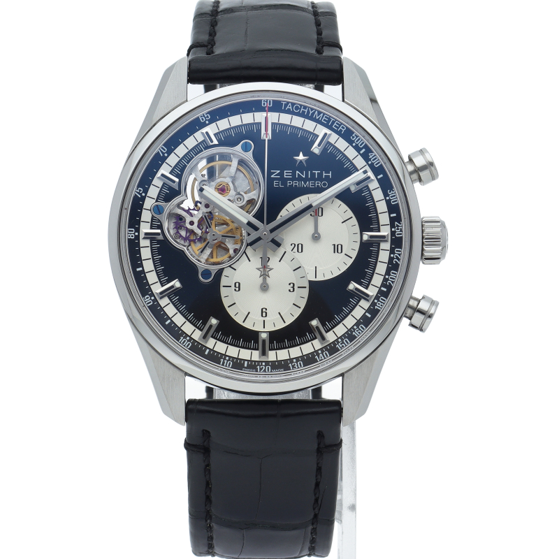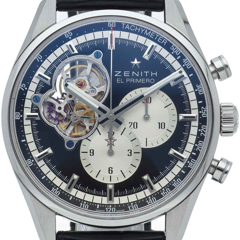 1969年発表の初代エル・プリメロをイメージした色使いに、現代のゼニスのシンボルであるダイヤルをくりぬいた“窓”を融合させた「エルプリメロ クロノマスター1969」。現在まで続く自動巻きクロノグラフの名機“エル・プリメロ”の歴史を表した一本と言えます。