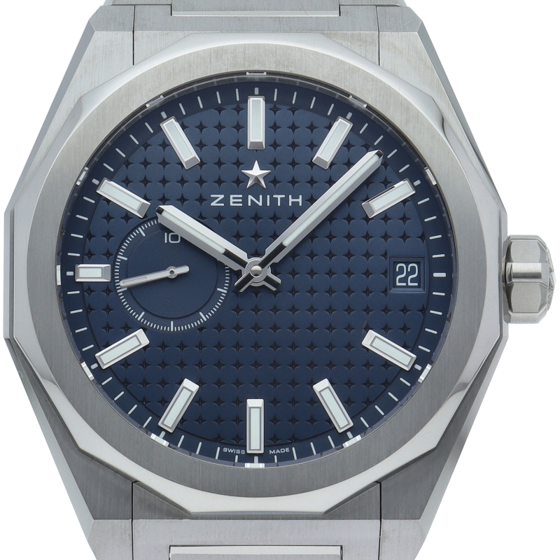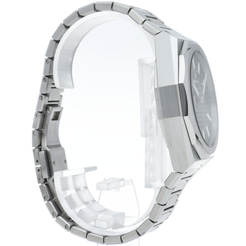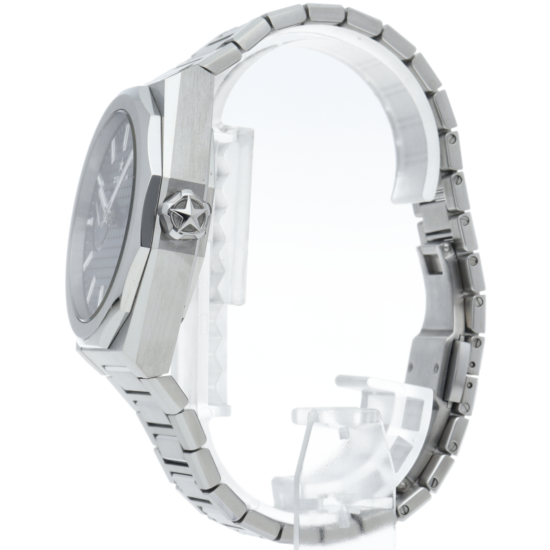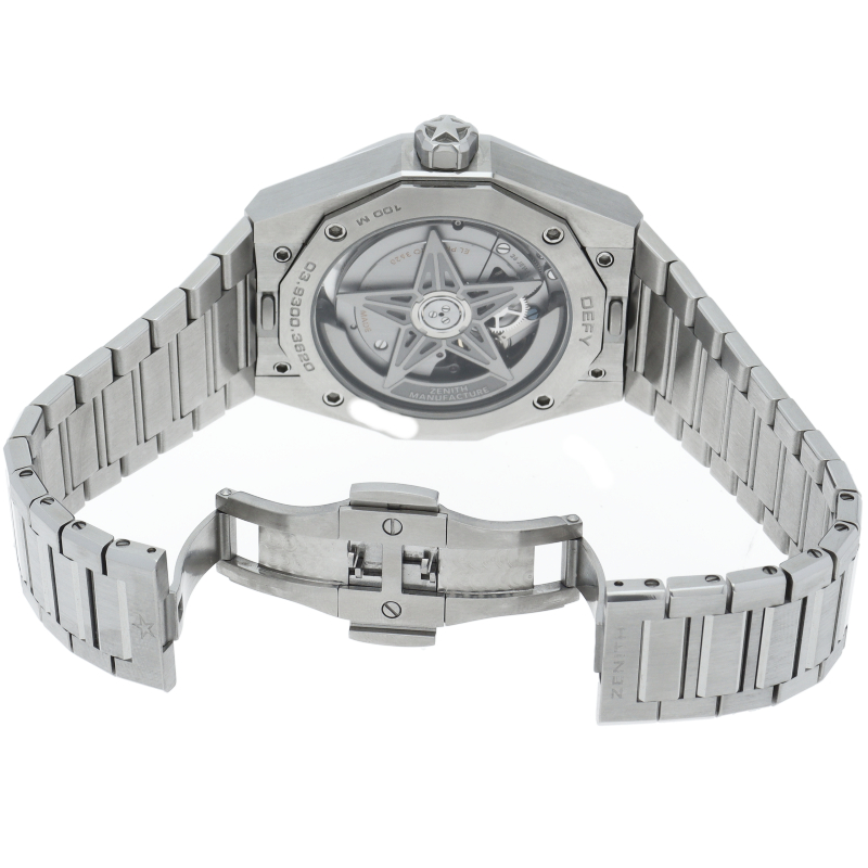 「デファイ スカイライン」は、単に過去のモデルを再現しようとしたのではなく、初期のデファイ モデルのユニークな八角形のフォルムからインスピレーションを得ています。ファセットカットのベゼルを配したステンレススチール製の八角形のケースを使用し、ブラックトーンのサンバースト仕上げを施した文字盤にはゼニスの象徴である4つの点を結んだ星を復刻させてあしらっています。