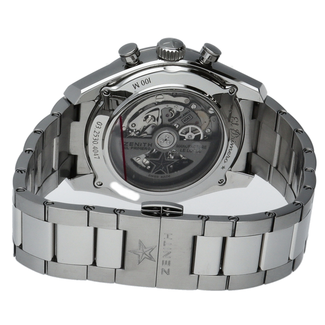 1969年発表の初代エル・プリメロをイメージした色使いに、現代のゼニスのシンボルであるダイヤルをくりぬいた「窓」を融合させた「エルプリメロ クロノマスター オープン」。シースルーバッグからムーブメントもご覧いただけます。