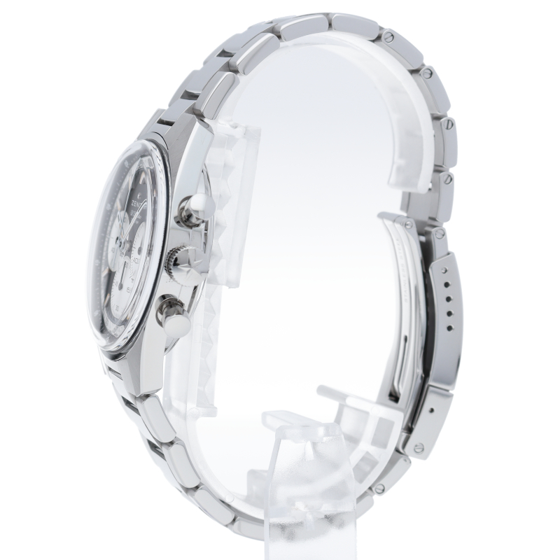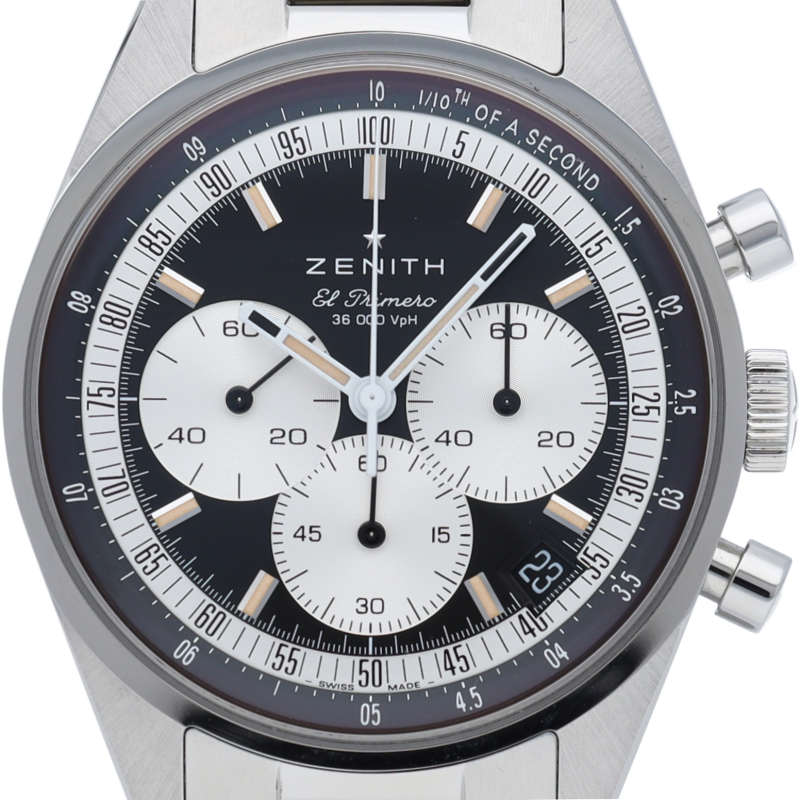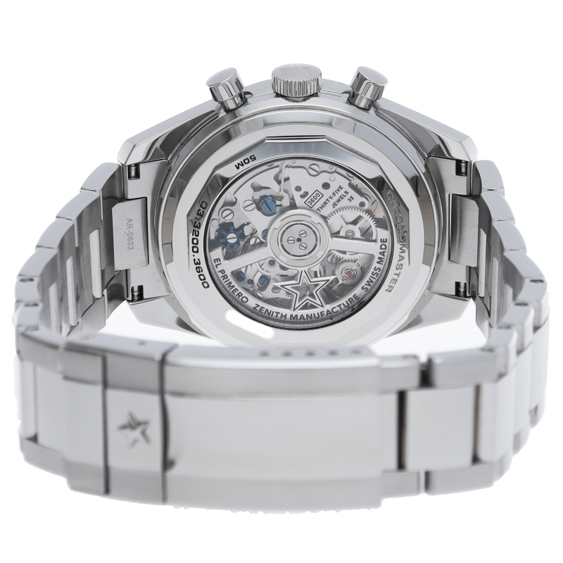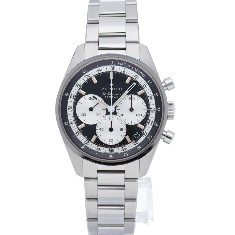 クロノマスター オリジナルには、A386と同じフォルムの38mmスチール製ケースが付属しており、ブラックの「逆パンダ」文字盤とスチール製ブレスレットが取り付けられています。高振動エル・プリメロ 3600自動巻クロノグラフムーブメントを搭載し、1/10秒精度のクロノグラフ機能と60時間のパワーリザーブを備えています。