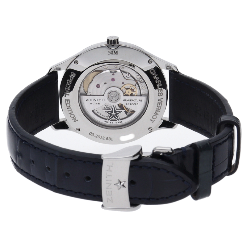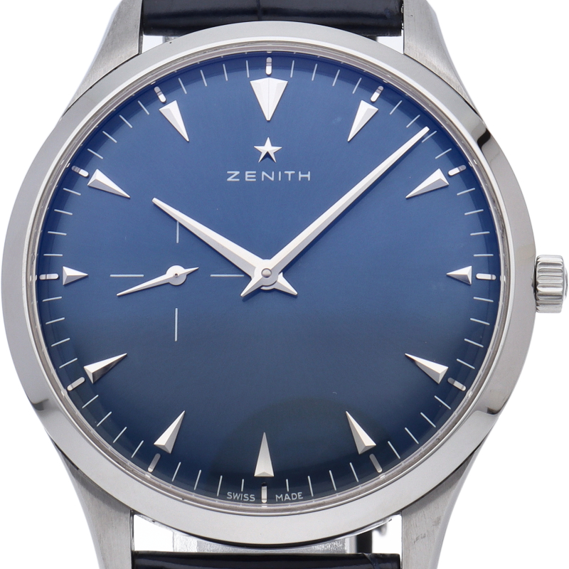 搭載される厚さ3.81mmの超薄型ムーブメント「エリート681」は、高い精度と品質を誇るゼニスの技術を投入して生み出された傑作ムーブメントです。ケースに収めた状態でも厚さはわずか7.6mm。自社ムーブメント搭載モデルでありながら、抑えた価格設定であることも魅力の一つです。
