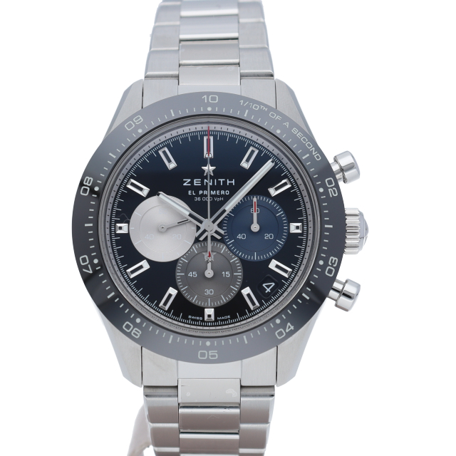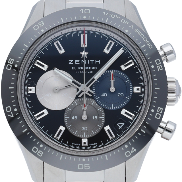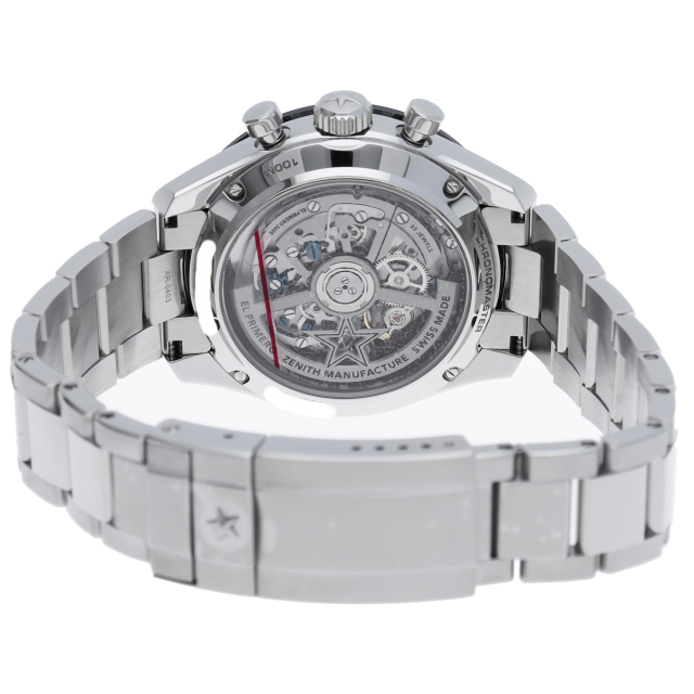 クロノマスター スポーツは、3色文字盤、ポンプ型のプッシュボタン、スチール製ブレスレットとセラミック製のブラックベゼルなど、過去のゼニス クロノグラフの要素を現代的な41mmケースに組み込んでいます。このバージョンには、ブラックの文字盤と一体型のスチール製ブレスレットが付属しています。