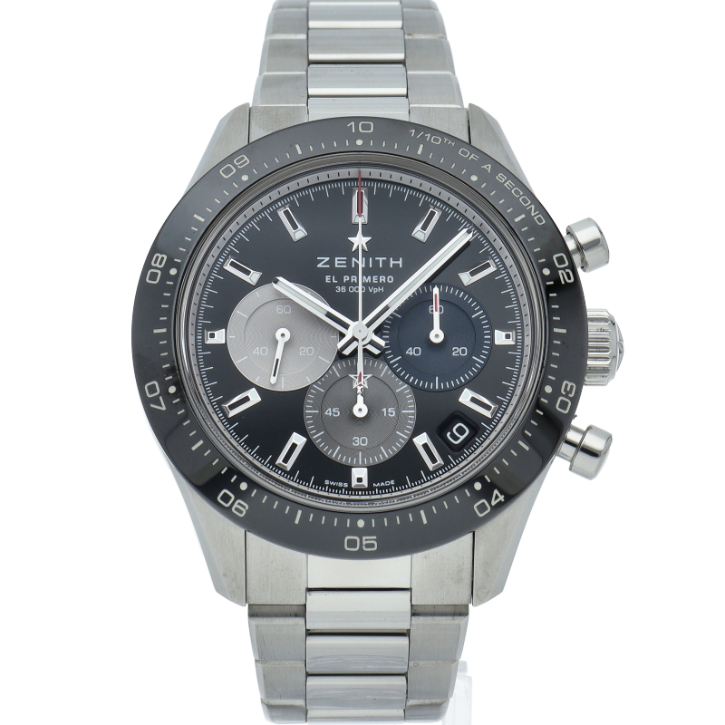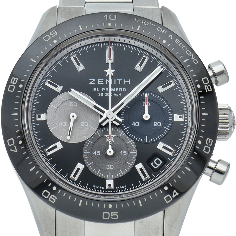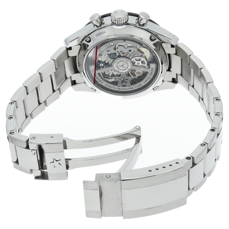 クロノマスター スポーツは、3色文字盤、ポンプ型のプッシュボタン、スチール製ブレスレットとセラミック製のブラックベゼルなど、過去のゼニス クロノグラフの要素を現代的な41mmケースに組み込んでいます。このバージョンには、ブラックの文字盤と一体型のスチール製ブレスレットが付属しています。