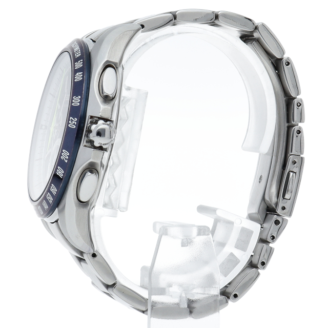 「49er class」の世界観を象徴する「海と風」をイメージし、ダイヤルとベゼルは光沢のあるブルーカラーを基調としました。ダイヤルリングと6時位置のサブダイヤルには、快走するヨットがあげる銀のしぶきを思わせるシルバーカラーをアクセントとして用い、さらにベゼルにはイタリック書体のアラビア数字を配し、スピード感を演出しています。SAGA055(8B82-0AF0)