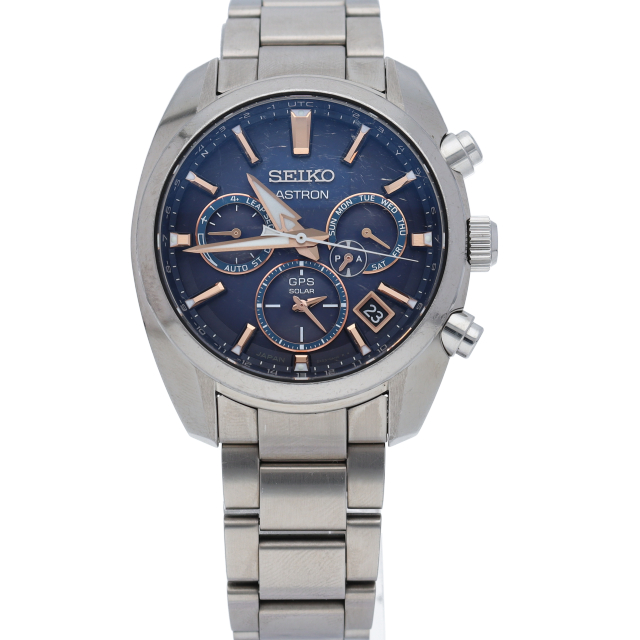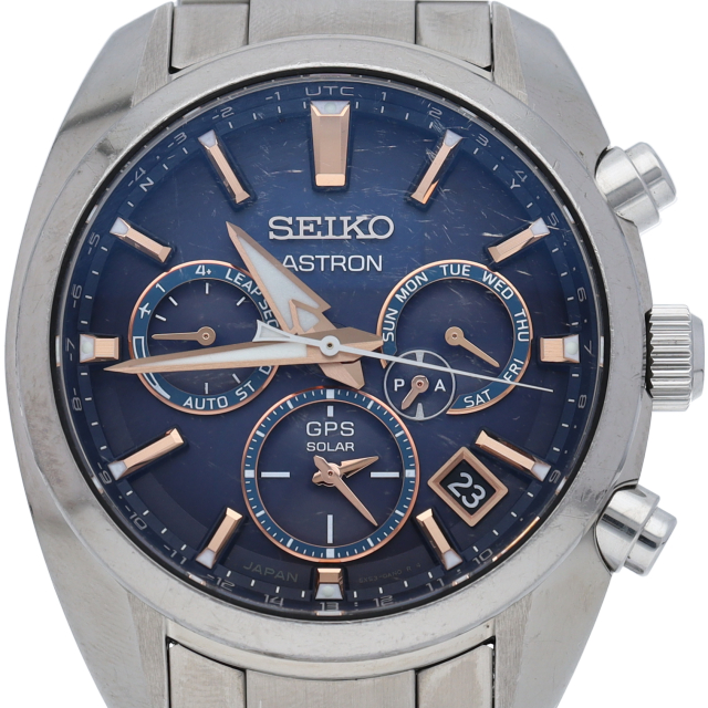 セイコーの世界初の技術で地球上のどこにいても、現在時刻を取得するソーラーGPS電波時計です。スーパークリアコーティングやダイヤシールドを採用したコンフォテックス仕様。。従来アストロンには無かった青から黒へシックなダークグラデーションを効かせたブルーダイヤルと、ピンクゴールド色の針・略字はモダンドレスな雰囲気を引き出す1本に仕上がっています。