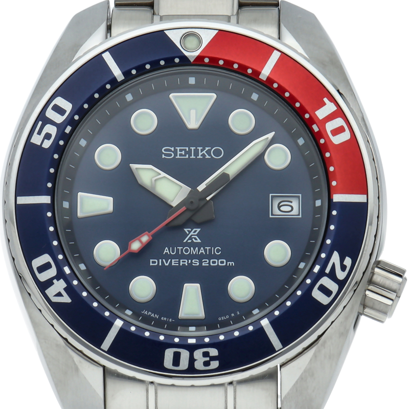 Diver ScubaモデルのSBDC057は、44ミリのステンレスケースとブルーのダイアルの相性が抜群。ブルーとレッドのコンボカラーの逆回転防止ベゼルと合わせてスポーティで魅力的なフェイスになっています。視認性の高いドットインデックスと3針には、暗闇でも活躍できるようにルミナス加工が施されています。SBDC057/6R15-04C0。
