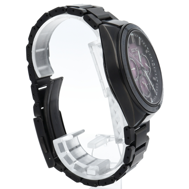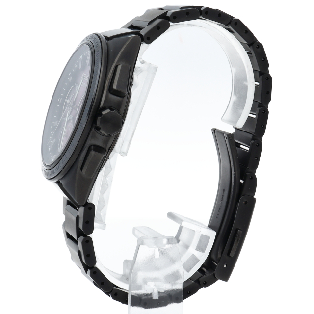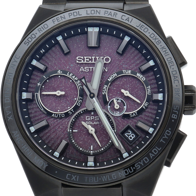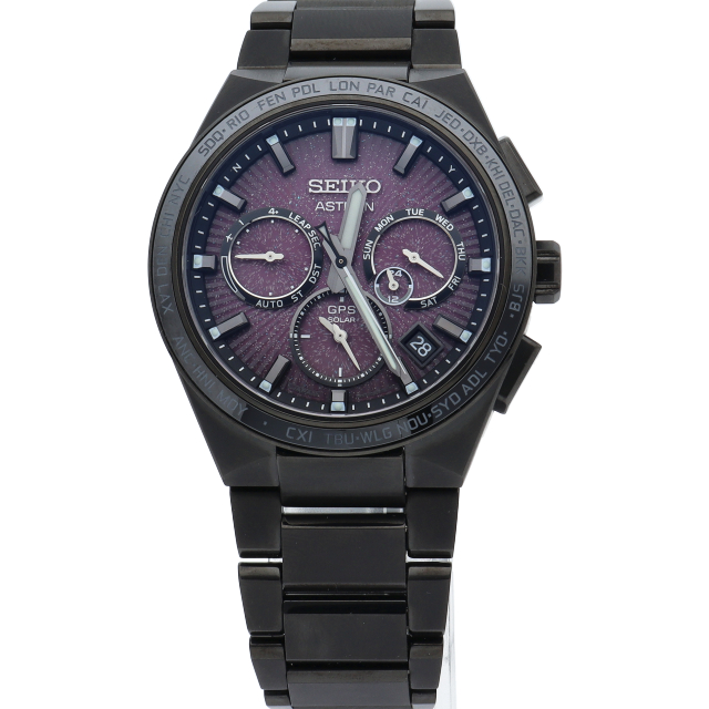 セイコーの世界初の技術で地球上のどこにいても、現在時刻を取得するソーラーGPS電波時計です。漆黒の宇宙をイメージしたオールブラックのケースに、SUPER-NOVA(超新星爆発)」の特別な輝きを、濃いパープルをベースとしたラメ入りのグラデーションでダイヤル上に表現しています。ケースとブレスにはスーパー ブラックダイヤシールドが施されています。SBXC123(5X53-0BW0)