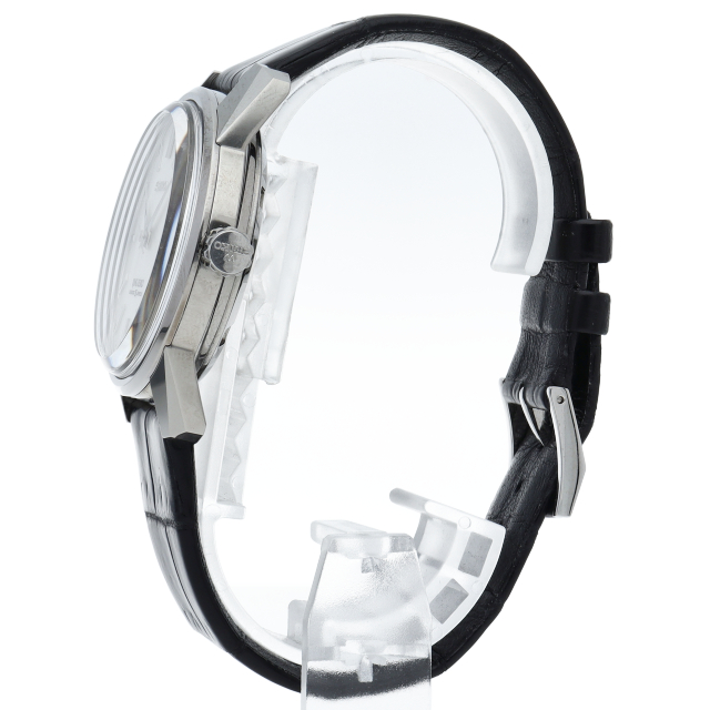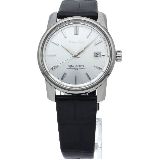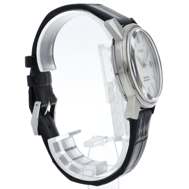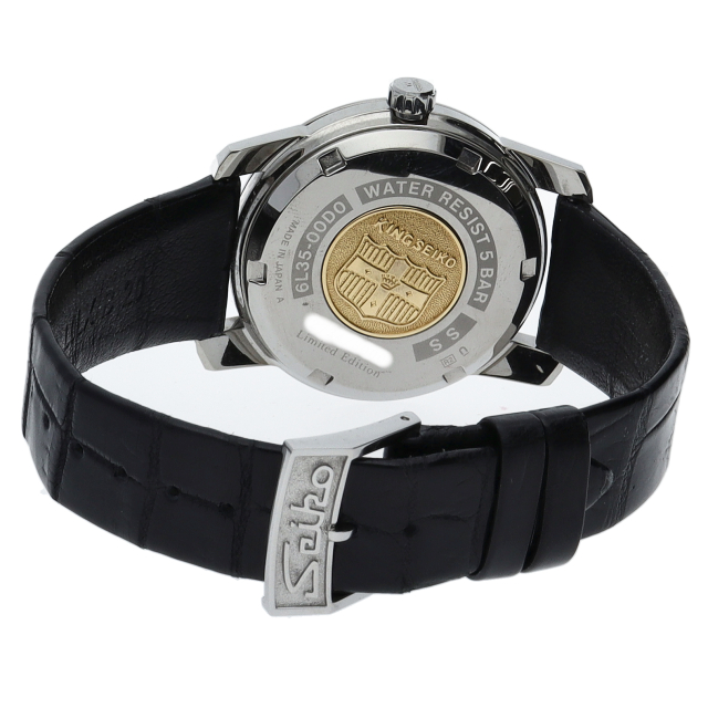 こちらのSDKA001は、セイコー創業140周年を記念し1965年発表のKSK(キングセイコー秒針規制付き)モデルを復刻した、世界3000本限。ミラー仕上げの裏蓋にはKSKのアイコン「盾」をモチーフにしたメダリオンと、限定である証とシリアルが刻印されています。ライターカットが美しい12時位置のインデックス、多面カットの太い時分針、特徴的なSeikoロゴの尾錠など、細部にわたりKSKの意匠を感じられます。SDKA001(6L35-00D0)
