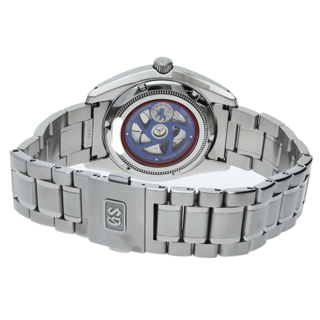 グランドセイコー誕生60周年を記念して日本の伝統色でありブランドカラーである「紺色」のダイヤルを使用した数量限定モデルです。硬化処理により耐久性がアップし巻き上げ効率も向上、天真も太くし耐衝撃も高めたキャリバー「9S65」を搭載。シースルーバックの裏蓋からは、岩手県の八幡平から覗く「岩手山」の朝焼けをイメージして作られた鮮やかなブルーの回転錘を覗くことができます。
