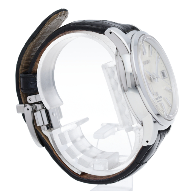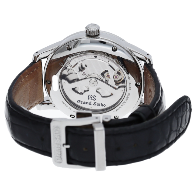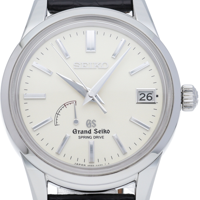 アイボリーダイアルとシルバーケースにクロコを組み合わせた格調高いグランドセイコーです。文字盤12時位置にブランドロゴを配置。裏蓋にはスケルトンバックを採用しています。スプリングドライブ9R65を搭載。SBGA093(8R65-0BJ0)