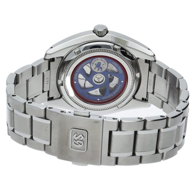 グランドセイコー誕生60周年を記念して日本の伝統色でありブランドカラーである「紺色」のダイヤルを使用した数量限定モデルです。硬化処理により耐久性がアップし巻き上げ効率も向上、天真も太くし耐衝撃も高めたキャリバー「9S65」を搭載。シースルーバックの裏蓋からは、岩手県の八幡平から覗く「岩手山」の朝焼けをイメージして作られた鮮やかなブルーの回転錘を覗くことができます。