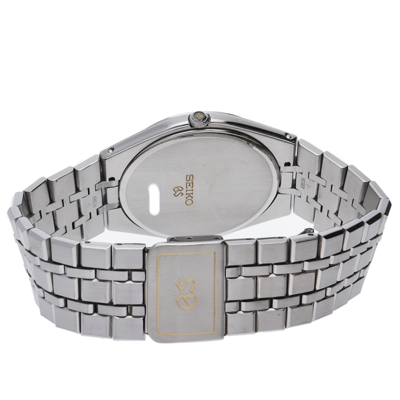 グランドセイコーは1970年代のクォーツ台頭で一時生産中止していましたが、年差±10秒の高精度クオーツキャリバーを搭載して1988年に復活を果たしました。こちらのモデルは直線的でスタイリッシュな薄型ケース、放射仕上げが施されたシャンパンゴールドの文字盤が上品に輝く、洗練されたドレスウォッチです。