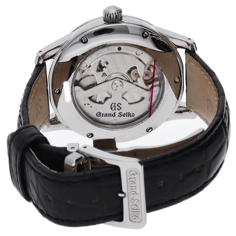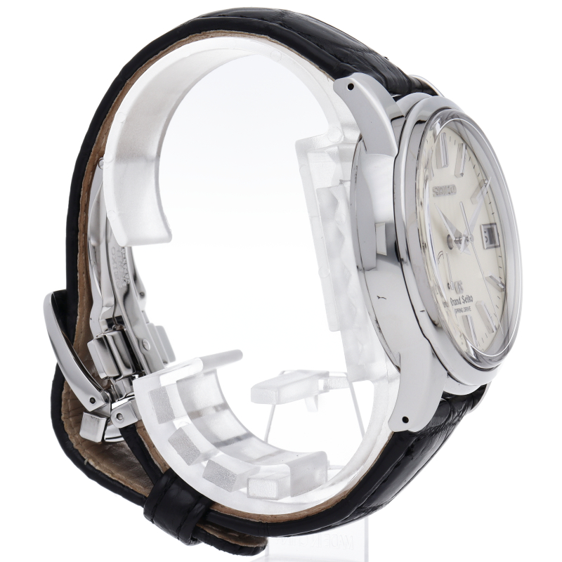 アイボリーダイアルとシルバーケースにクロコを組み合わせた格調高いグランドセイコーです。文字盤12時位置にブランドロゴを配置。裏蓋にはスケルトンバックを採用しています。スプリングドライブ9R65を搭載。SBGA093(8R65-0BJ0)