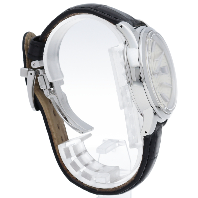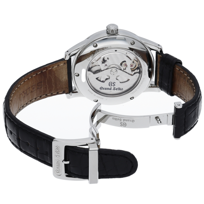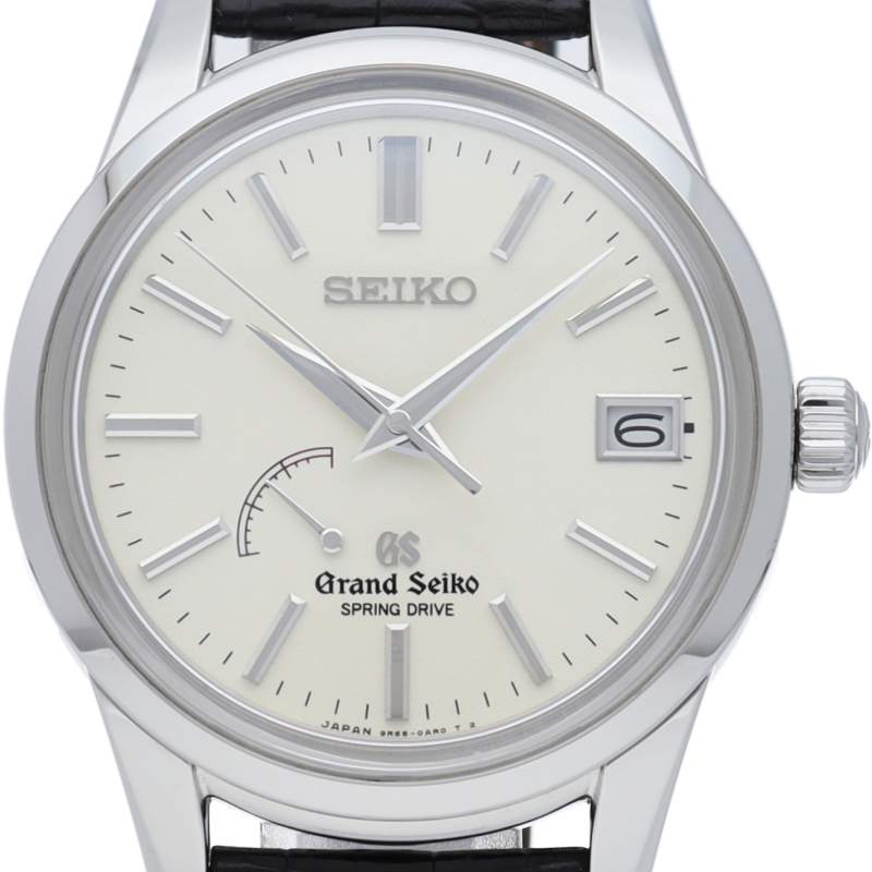 アイボリーダイアルとシルバーケースにクロコを組み合わせた格調高いグランドセイコーです。文字盤12時位置にブランドロゴを配置。裏蓋にはスケルトンバックを採用しています。スプリングドライブ9R65を搭載。SBGA093/8R65-0BJ0