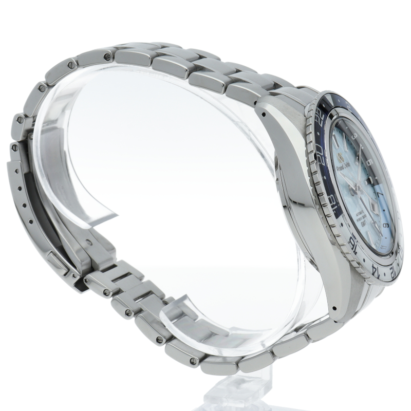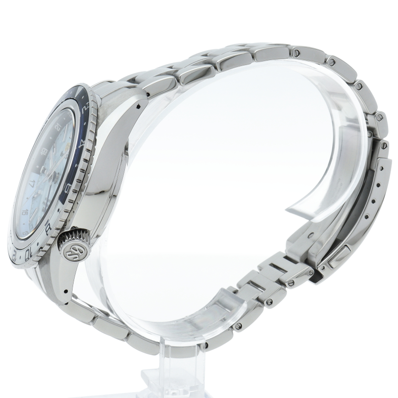 メカニカルムーブメント「キャリバー9S」の誕生25周年を記念した限定モデルです。グランドセイコーの機械式時計を生み出す製造地「グランドセイコースタジオ 雫石」から望む岩手山に広がる「雲海」と空の美しさを、ダイヤルと回転錘の爽やかなスカイブルーの色合いで表現しています。SBGJ275/9S86-00W0。