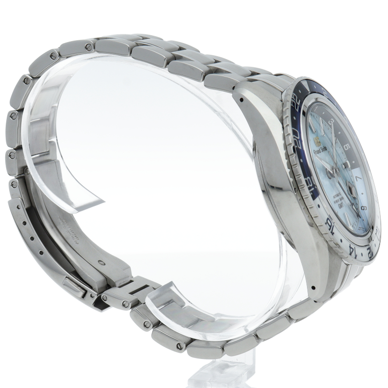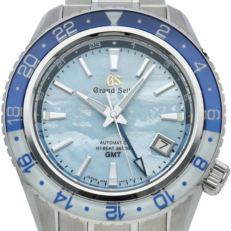 メカニカルムーブメント「キャリバー9S」の誕生25周年を記念した限定モデルです。グランドセイコーの機械式時計を生み出す製造地「グランドセイコースタジオ 雫石」から望む岩手山に広がる「雲海」と空の美しさを、ダイヤルと回転錘の爽やかなスカイブルーの色合いで表現しています。SBGJ275/9S86-00W0。