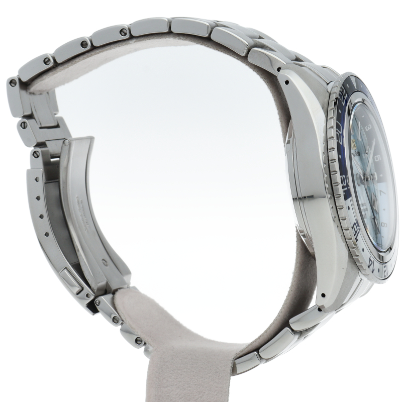 メカニカルムーブメント「キャリバー9S」の誕生25周年を記念した限定モデルです。グランドセイコーの機械式時計を生み出す製造地「グランドセイコースタジオ 雫石」から望む岩手山に広がる「雲海」と空の美しさを、ダイヤルと回転錘の爽やかなスカイブルーの色合いで表現しています。SBGJ275/9S86-00W0。