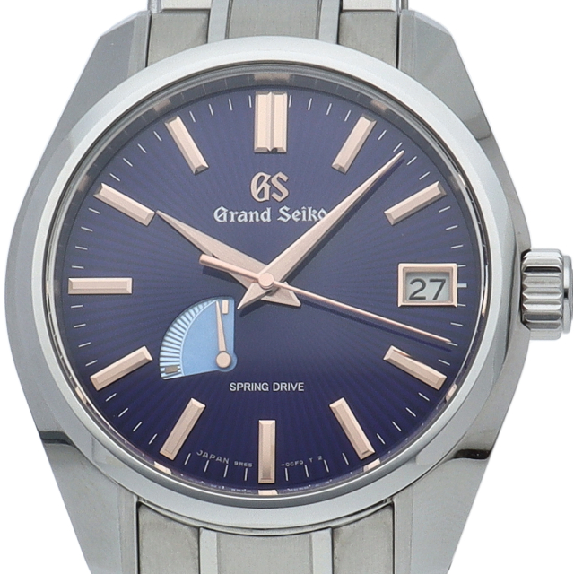 2021年発売の銀座200本限定モデルです。名機「44GS」のケースに放射状のパターンを施したブルーダイヤルと、ピンクゴールド色の針とインデックスが特徴です。ハイブリッドムーブメントスプリングドライブ「9R65」搭載。同社独自。SBGA447(9R65-0EB0)。