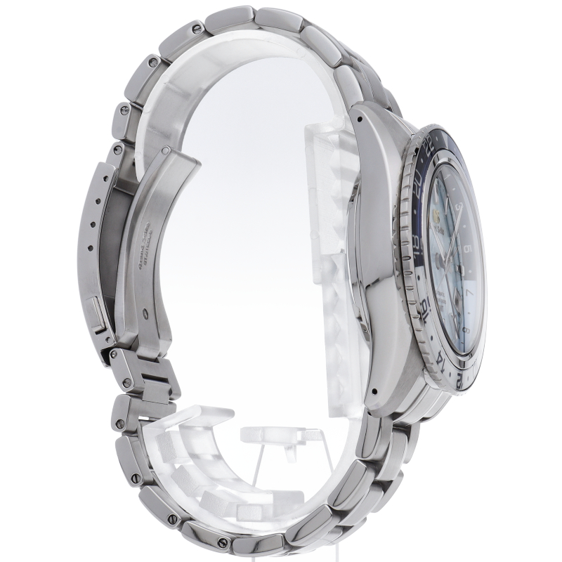 メカニカルムーブメント「キャリバー9S」の誕生25周年を記念した限定モデルです。グランドセイコーの機械式時計を生み出す製造地「グランドセイコースタジオ 雫石」から望む岩手山に広がる「雲海」と空の美しさを、ダイヤルと回転錘の爽やかなスカイブルーの色合いで表現しています。SBGJ275(9S86-00W0)
