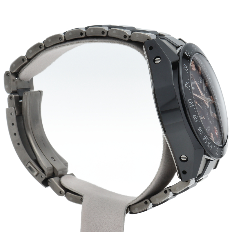 スプリングドライブクロノグラフの10周年記念限定モデル、「 ブラックセラミックスコレクション スプリングドライブ GMT」。正確な精度に特別調整されたキャリバー「9R96」を搭載。ジルコニアセラミックスとブライトチタンのコンビで見た目だけではない強度と軽量化を追求した利便性も兼ね揃えたモデルです。SBGC219/9R96-0AD0