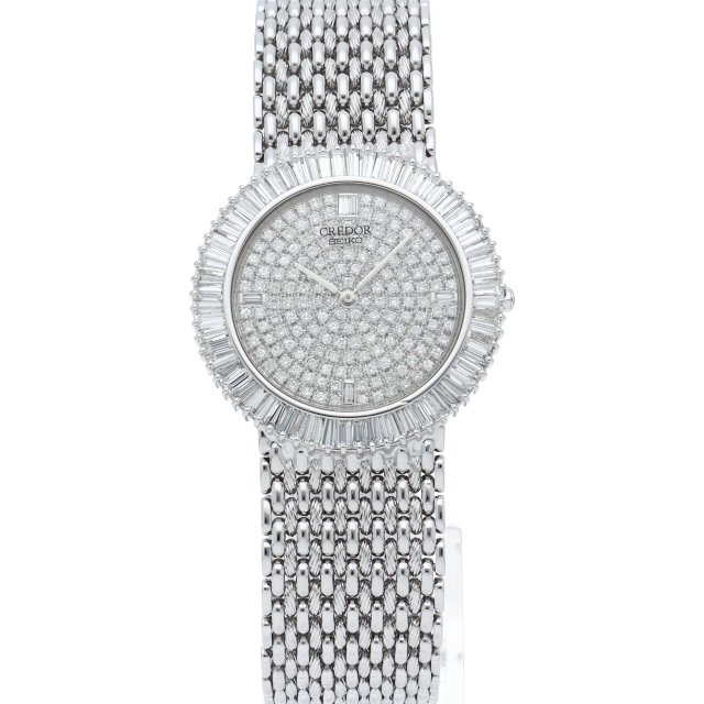 国産ブランド「セイコー」を代表するドレスウォッチライン「クレドール」。上品なホワイトゴールドを贅沢に使用、デザイン性も良く、ベゼルと文字盤にはダイヤモンドが施されたエレガントな1本。