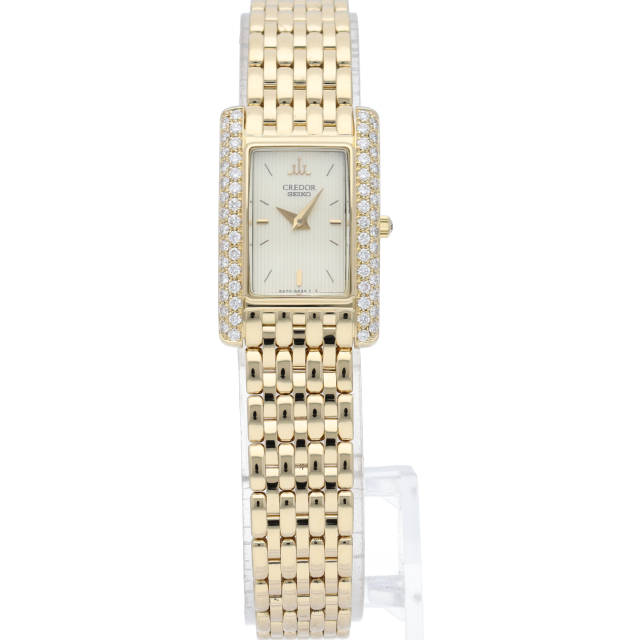 国産ブランド「セイコー」を代表するドレスウォッチライン「クレドール」。上品なイエローゴールドを贅沢に使用、デザイン性も良く、ベゼルにはダイヤモンドが施されたエレガントな1本。