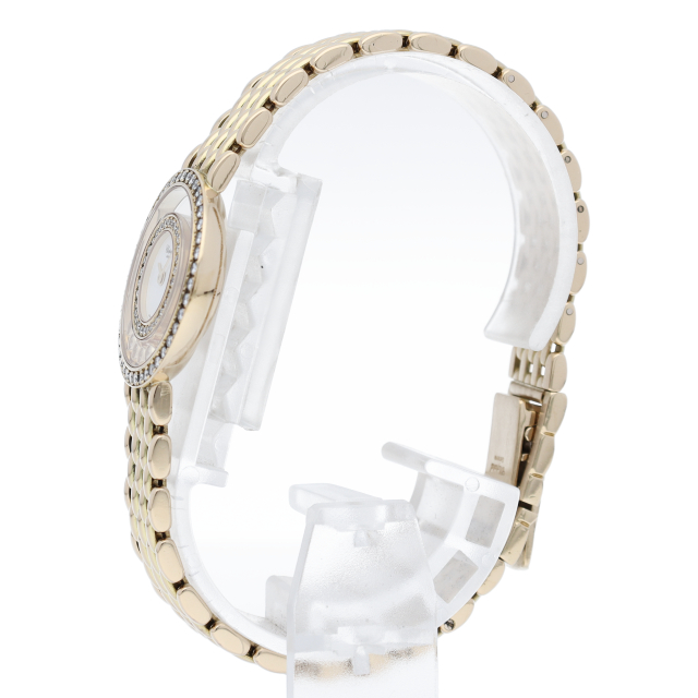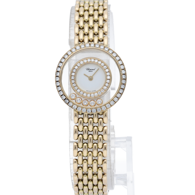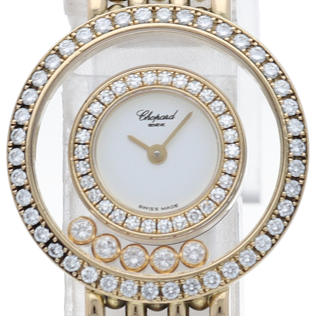ショパールを代表モデルする人気ウォッチ「ハッピーダイヤモンド」。ダイアルの中を自由に動き回るダイヤモンドはまさにフェミニンの象徴です。ベゼルと文字盤にもダイヤモンドが施された高級感溢れる1本。