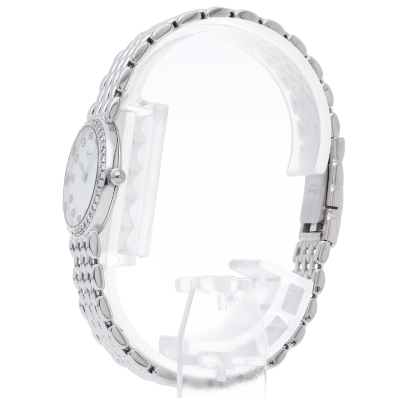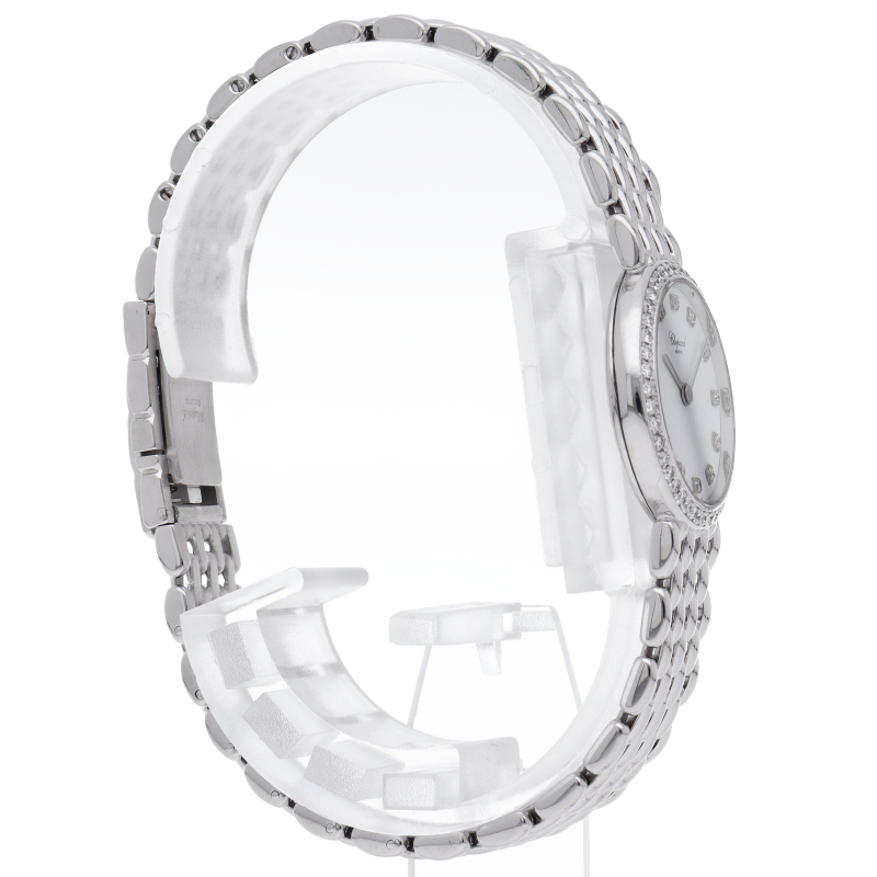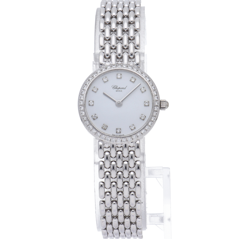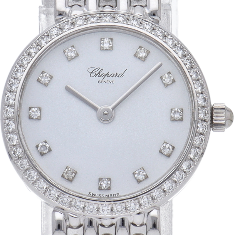 ショパールのジュエリーウォッチです。クラシカルなデザインながらシンプルでベゼルのダイヤが豪華さを上品に演出しています。