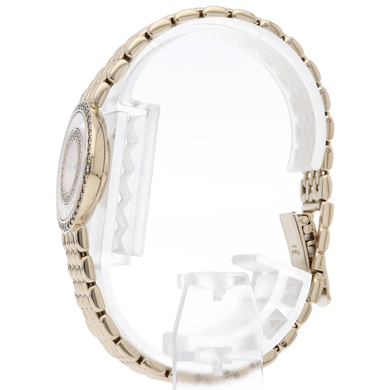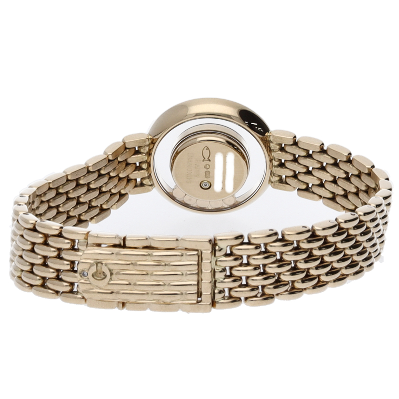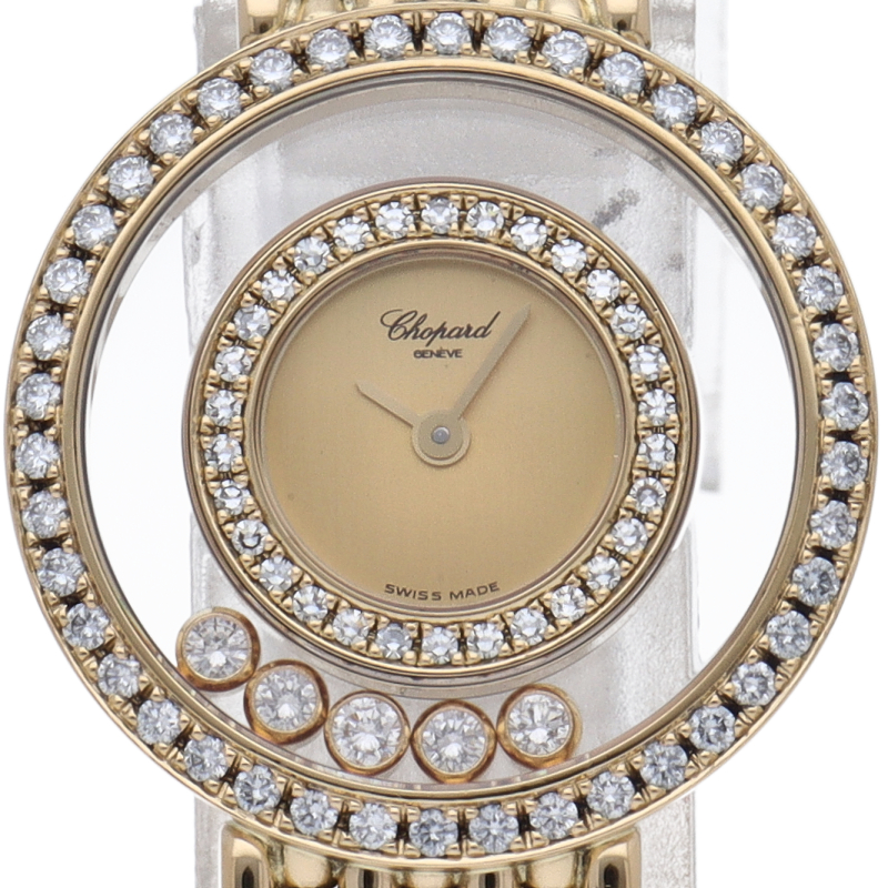 ショパールを代表モデルする人気ウォッチ「ハッピーダイヤモンド」。ダイアルの中を自由に動き回るダイヤモンドはまさにフェミニンの象徴です。ベゼルと文字盤にもダイヤモンドが施された高級感溢れる1本。