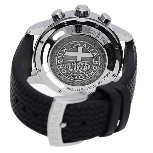 イタリアン・ビンテージカーの傑作アルファ・ロメオ6C 1750 GSの栄光を称えた限定品。1930年に開催されたミッレミリアにて、メルセデスやアルカンジェーリのマセラーティなど強豪を抑えて1位から4位を独占しました。裏蓋には月桂樹と、当時のアルファ・ロメオのエンブレムやシリアルなど刻まれております。