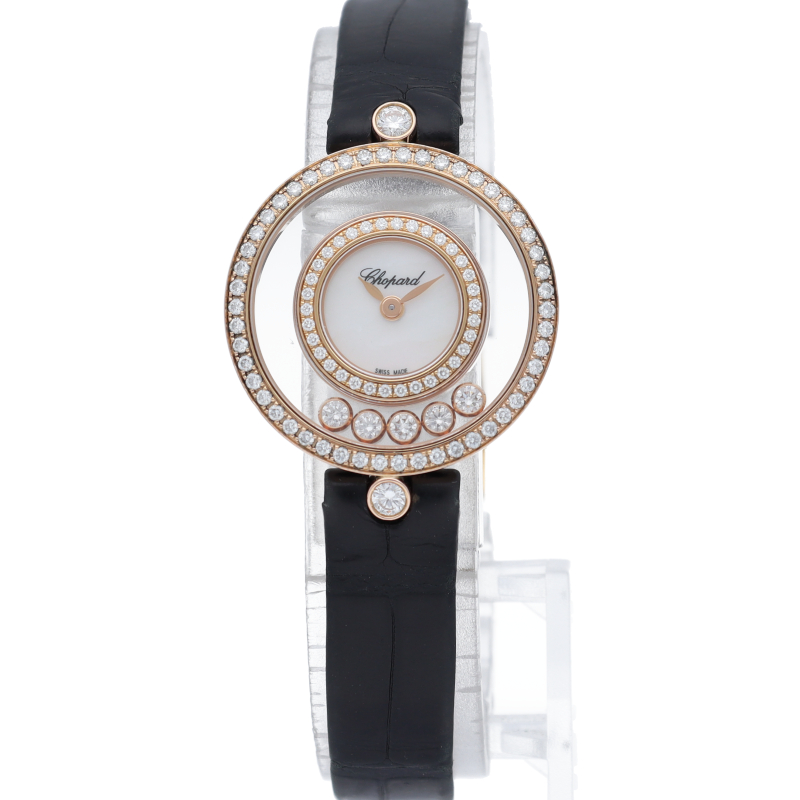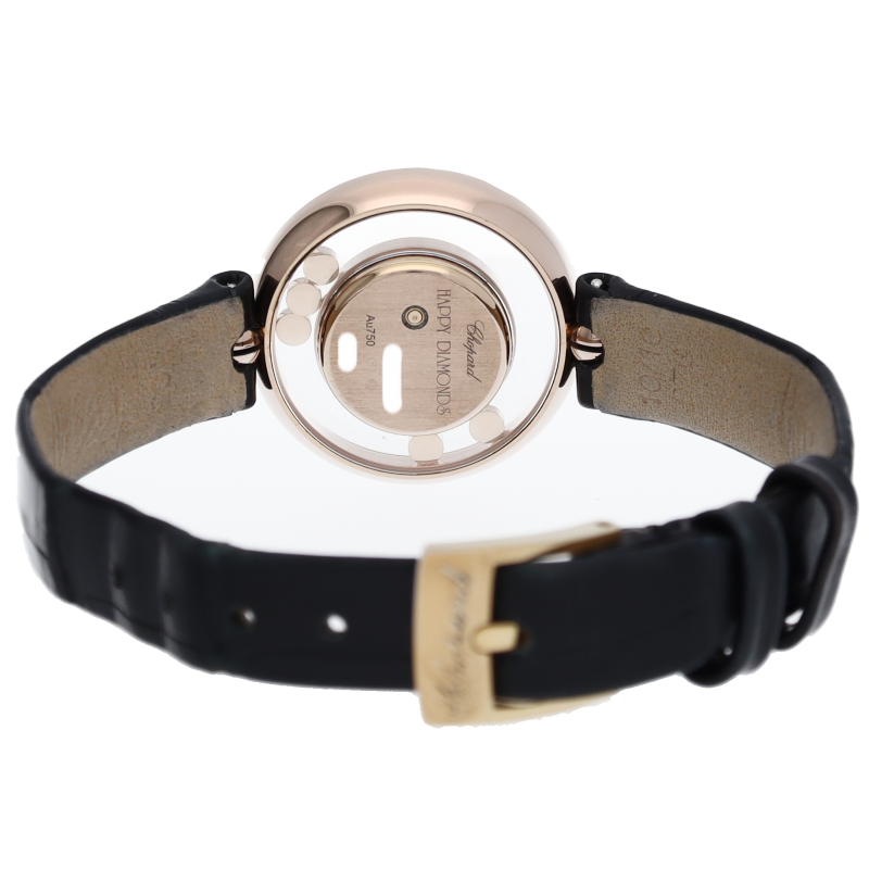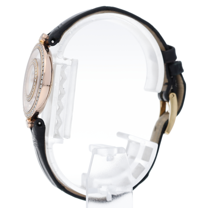 精緻の限りを尽くして手作業で作り上げられたケースには透明な部分があり、自由と光に満ちた壮麗なディスプレイの中で、ショパールの象徴でもあるムービングダイヤモンドが2つのサファイアクリスタルの間を自由にスライドして行き来し、腕元を美しく演出してくれます。