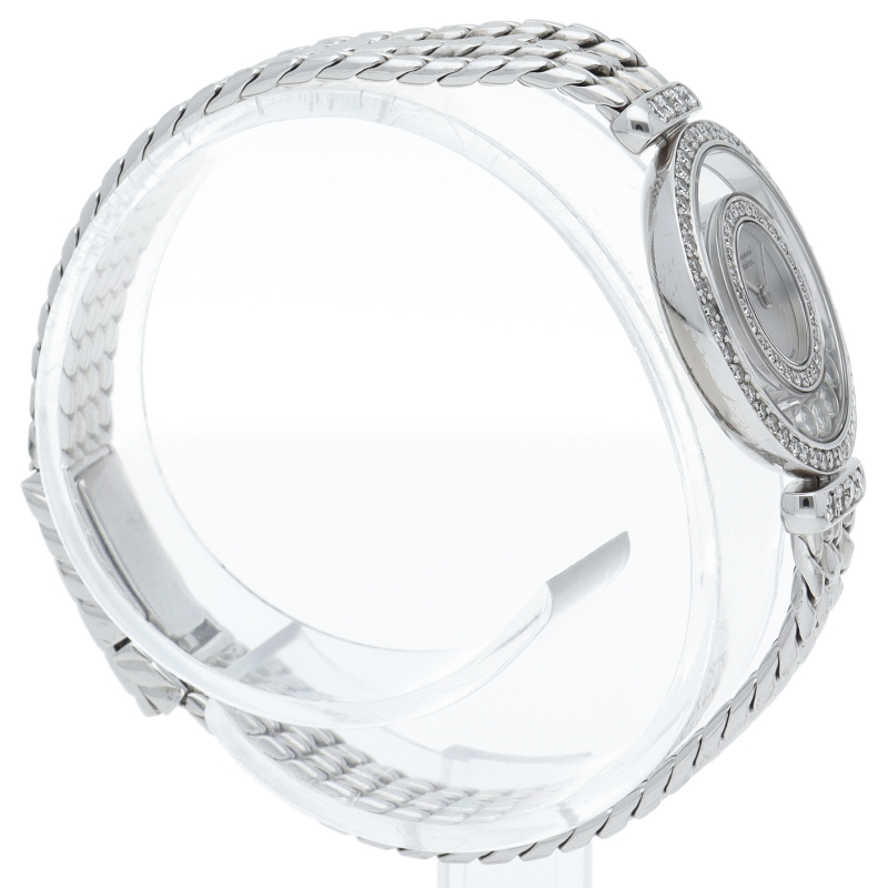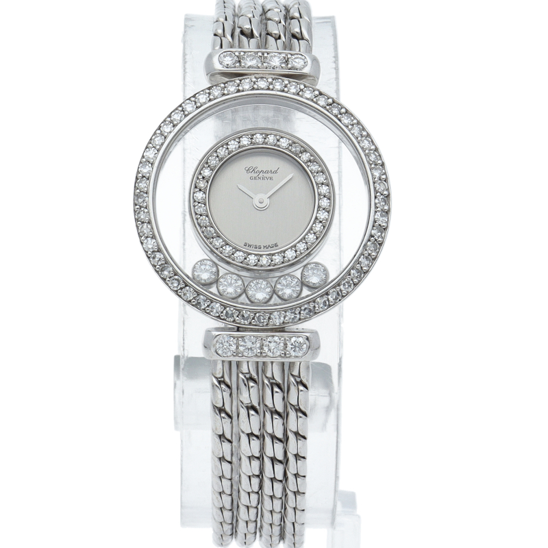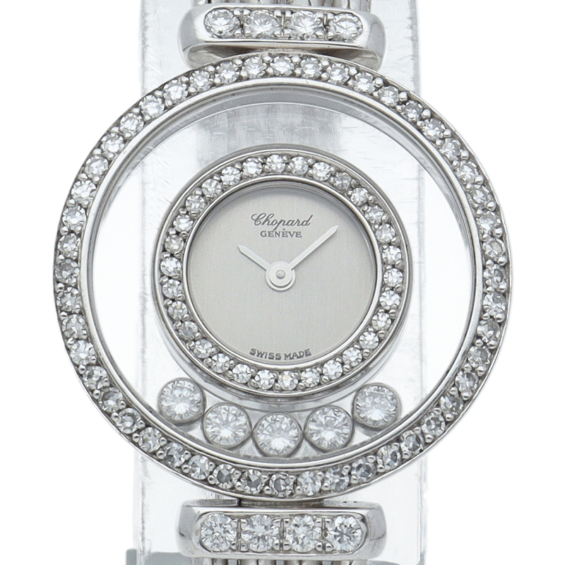 ショパールを代表モデルする人気ウォッチ「ハッピーダイヤモンド」。ダイアルの中を自由に動き回るダイヤモンドはまさにフェミニンの象徴です。ベゼルと文字盤にもダイヤモンドが施された貴重な一本です。