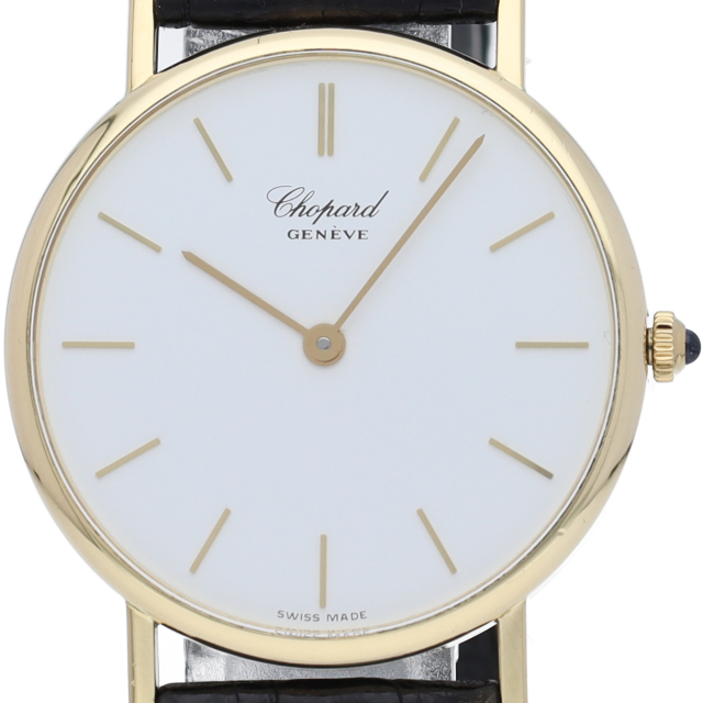 現在のトレンドである大きめの時計に比べ、繊細さとエレガンスが感じられる大きさです。小柄ながらショパールの存在を感じるシンプルな一本です。