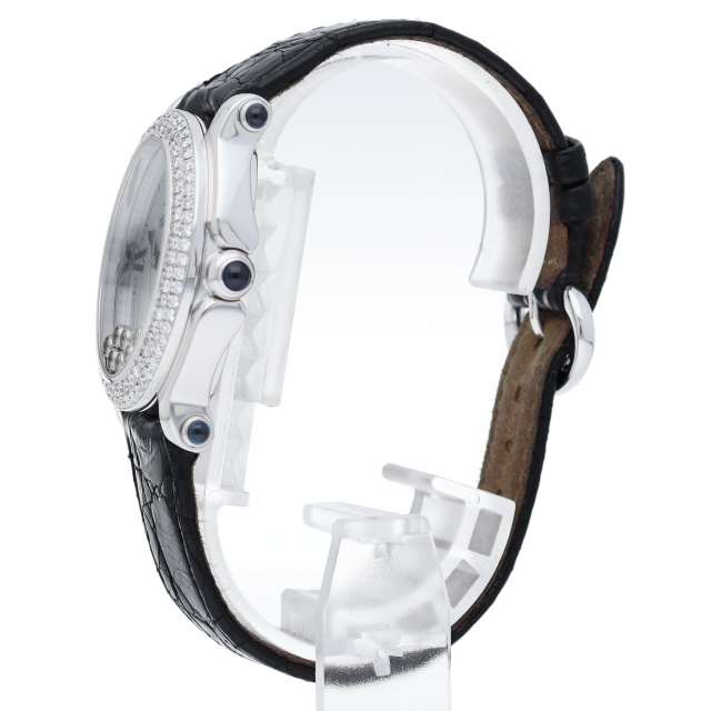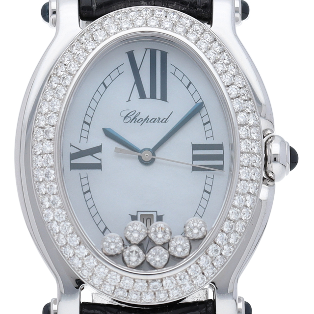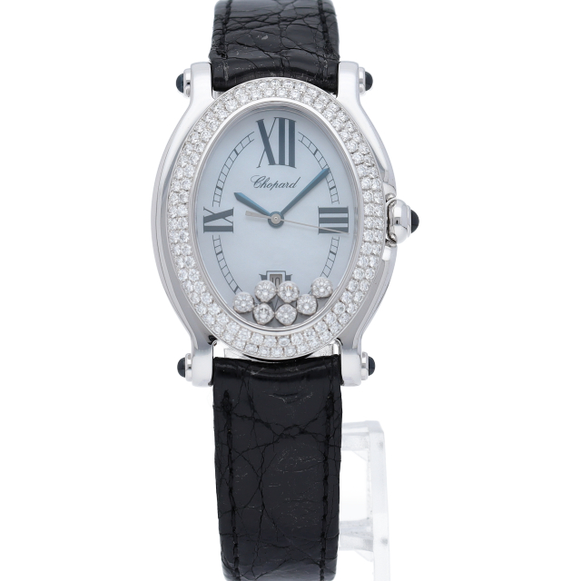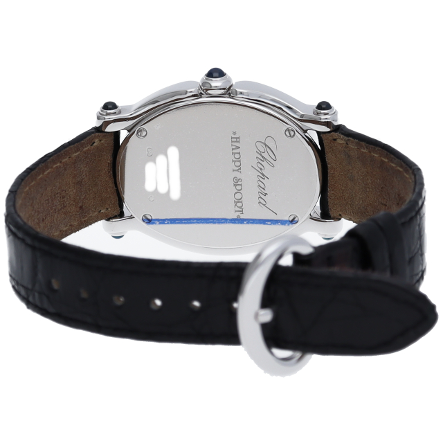女性の憧れの人気ブランド「ショパール」。白文字盤の上をクルクルと動き回るダイヤが特徴的なハッピースポーツ。上品ながらも遊び心を取り入れた人気モデル。ガラスに5個のムーブダイヤ入。リューズ・ラグ4隅はルビー仕様です。