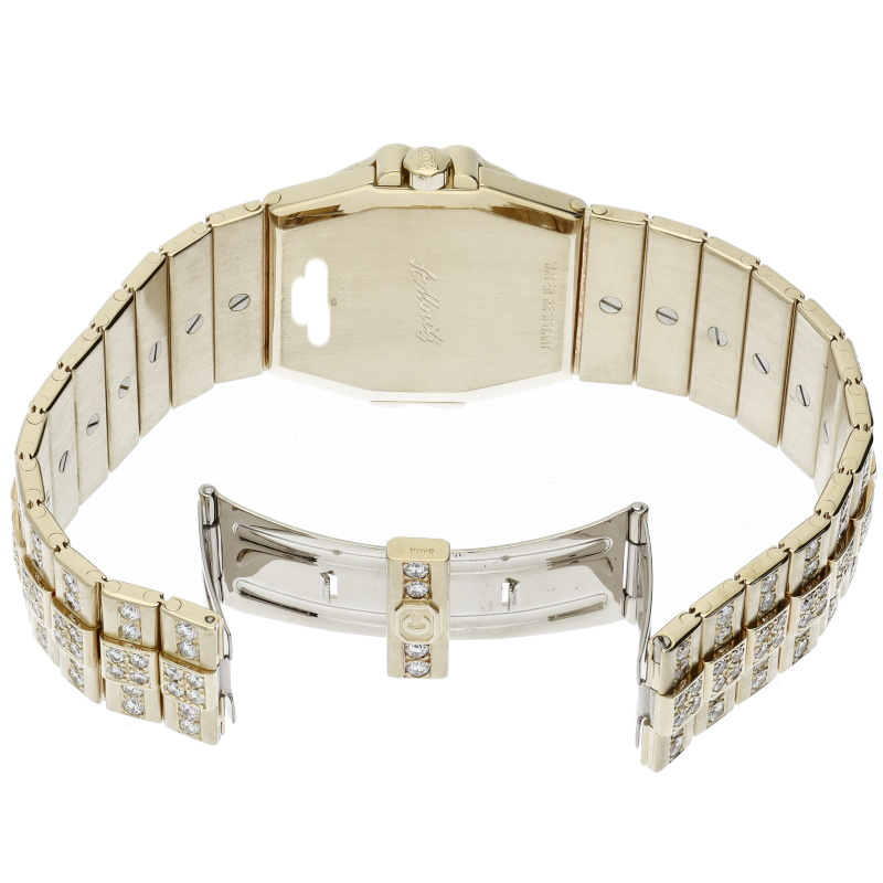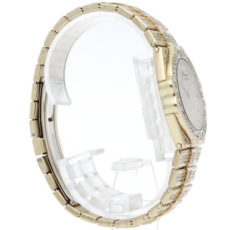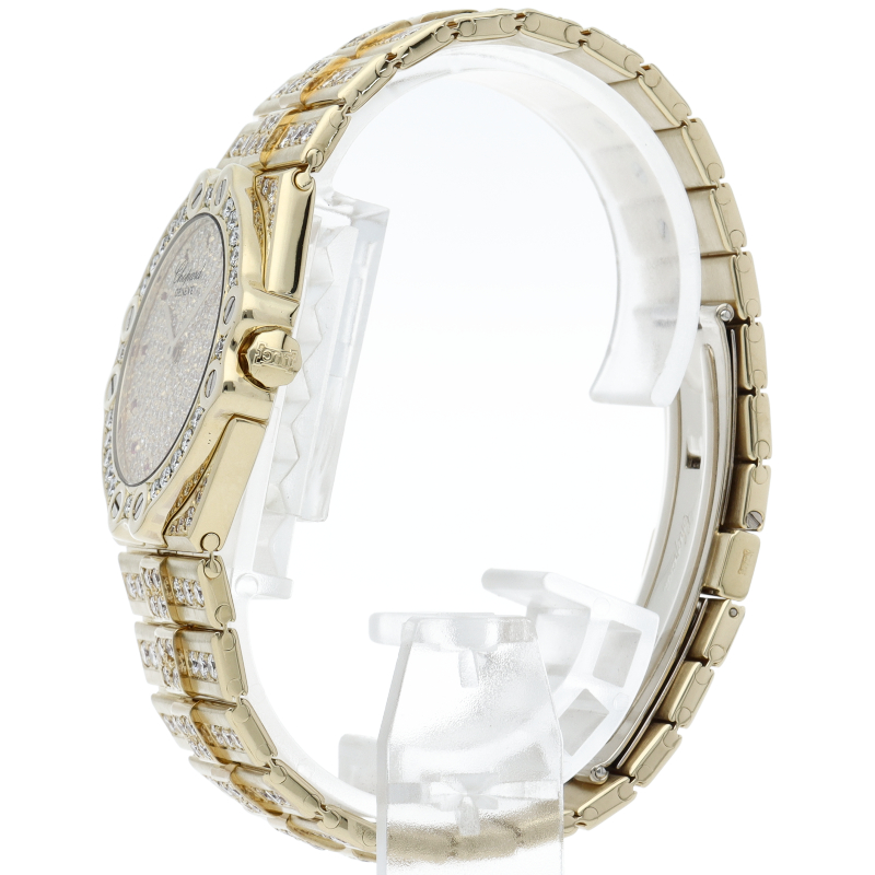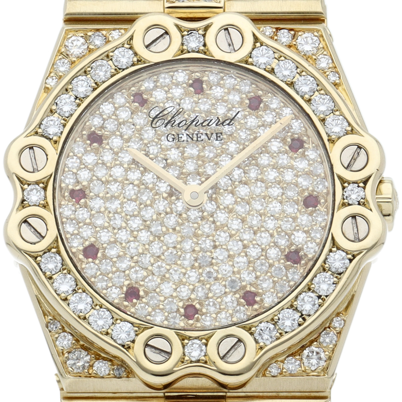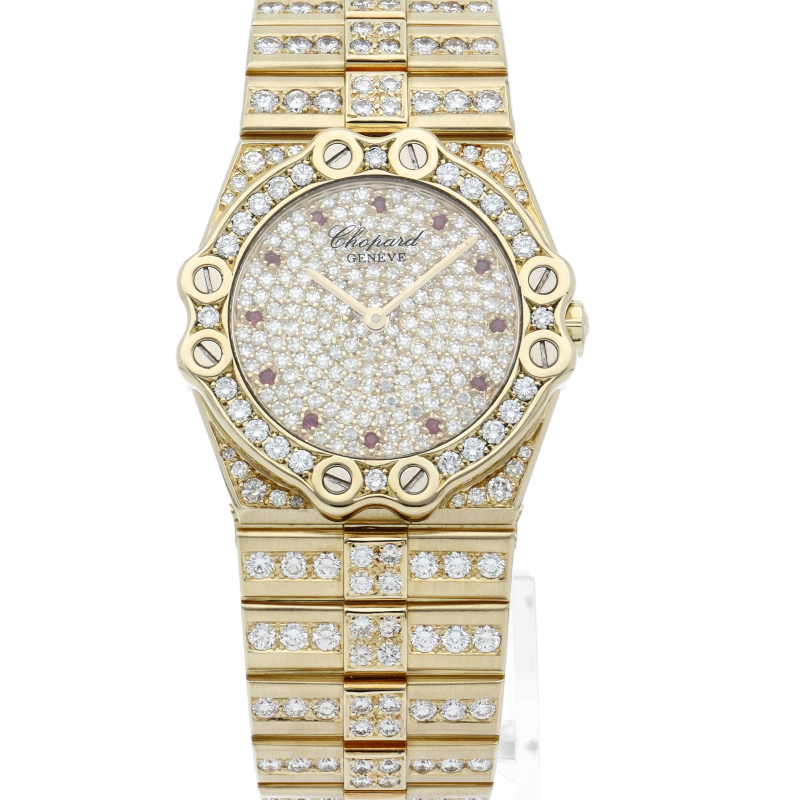 1980年にショパールの共同社長を務めるカールーフリードリッヒ・ショイフレ氏がデザインした「サンモリッツ」。文字盤、ブレスには満遍なくダイヤが施され、素敵な輝きを放つ極上の一本となっております。