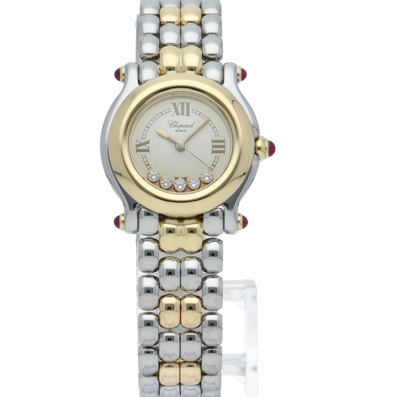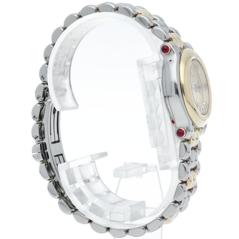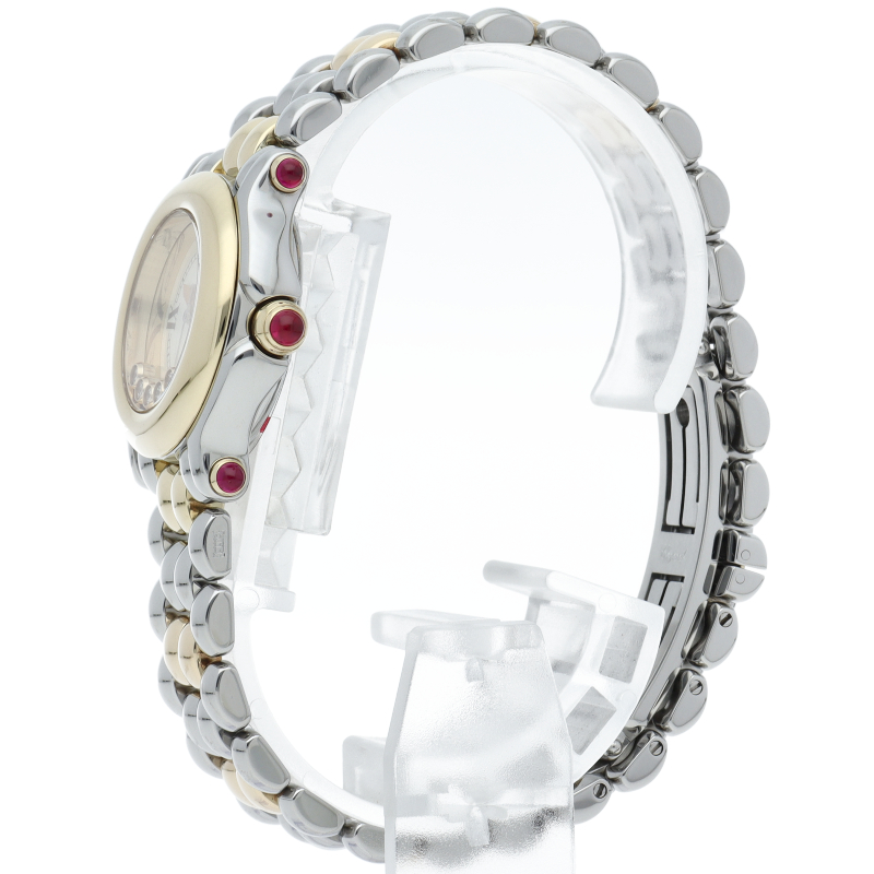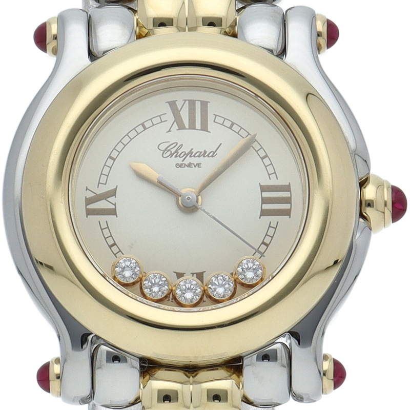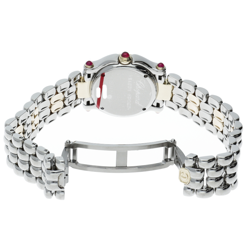 女性の憧れの人気ブランド「ショパール」。白文字盤の上をクルクルと動き回るダイヤが特徴的なハッピースポーツ。上品ながらも遊び心を取り入れた人気モデル。ガラスに5個のムーブダイヤ入。リューズ・ラグ4隅はルビー仕様です。