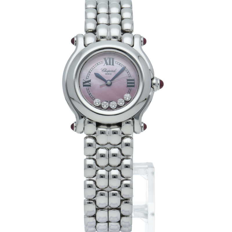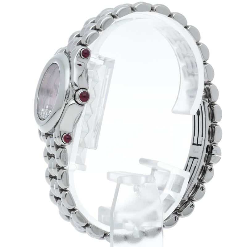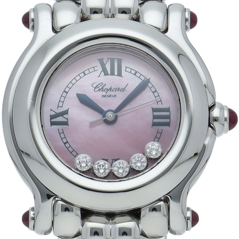 女性の憧れの人気ブランド「ショパール」。文字盤の上をクルクルと動き回るダイヤが特徴的なハッピースポーツ。上品ながらも遊び心を取り入れた人気モデル。リューズ・ラグ4隅はルビー仕様です。