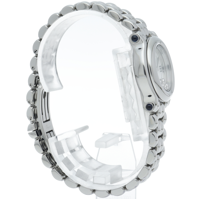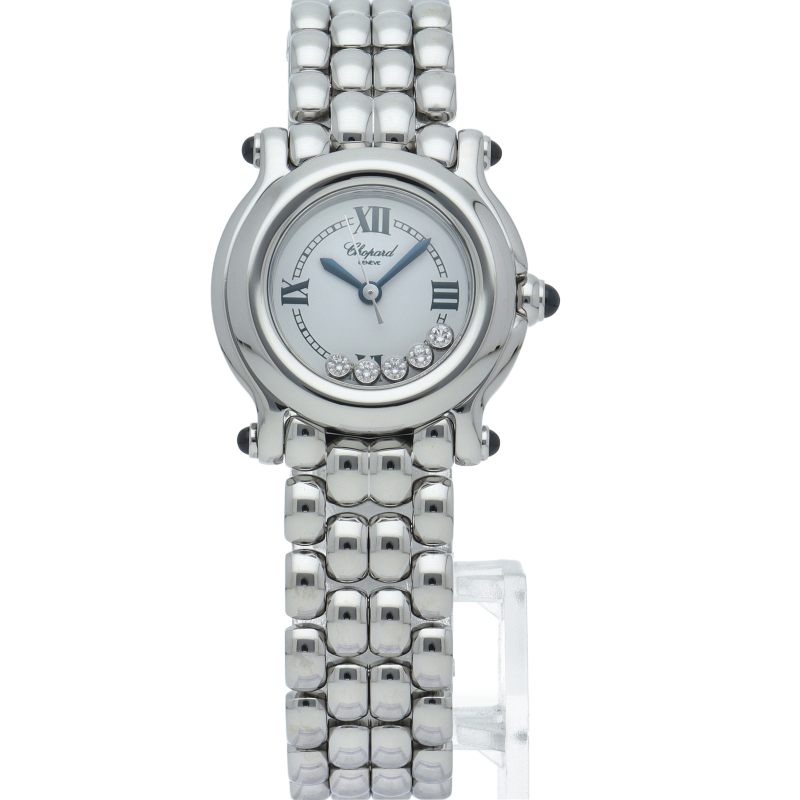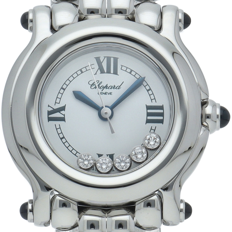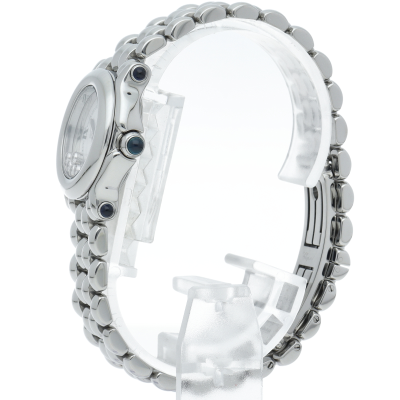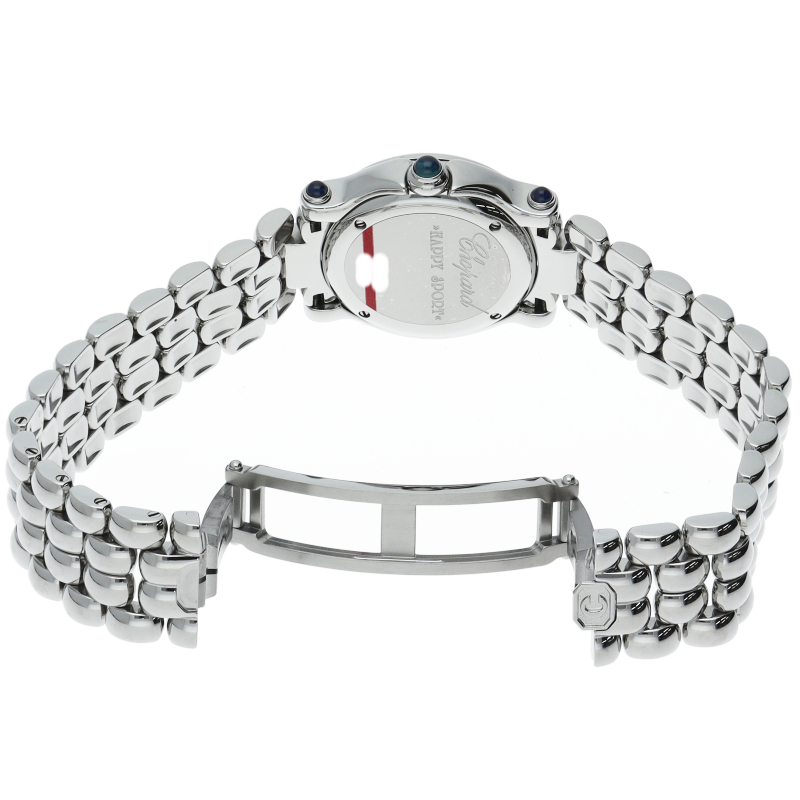 女性の憧れの人気ブランド「ショパール」。文字盤の上をクルクルと動き回るダイヤが特徴的なハッピースポーツ。上品ながらも遊び心を取り入れた人気モデル。リューズ・ラグ4隅はサファイア仕様です。