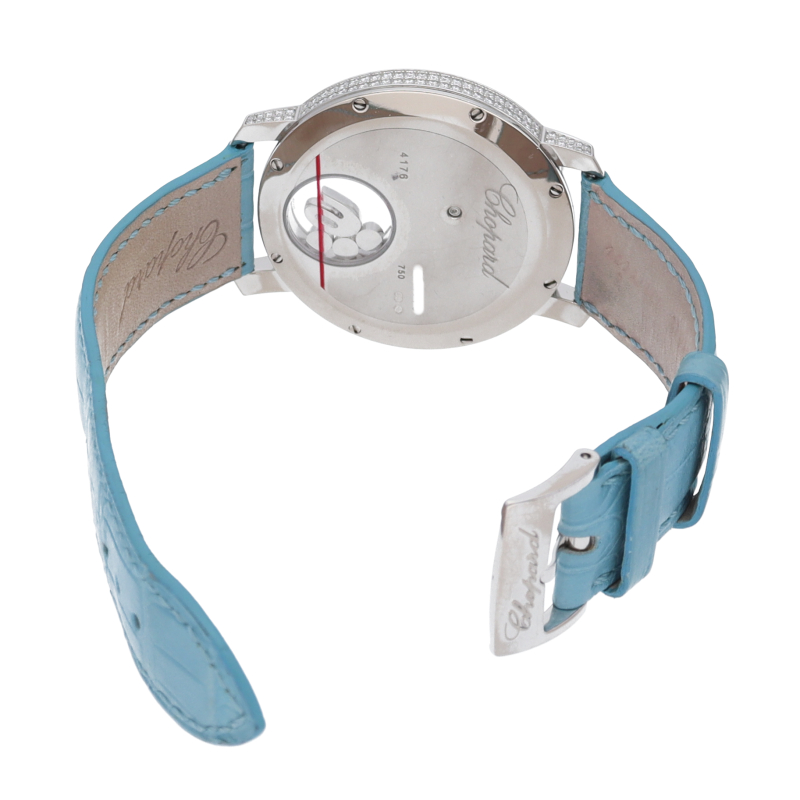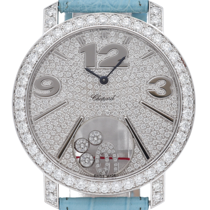 女性の憧れの人気ブランド「ショパール」。ベゼル、文字盤にはダイヤモンドが施された上品でキュートなモデル。