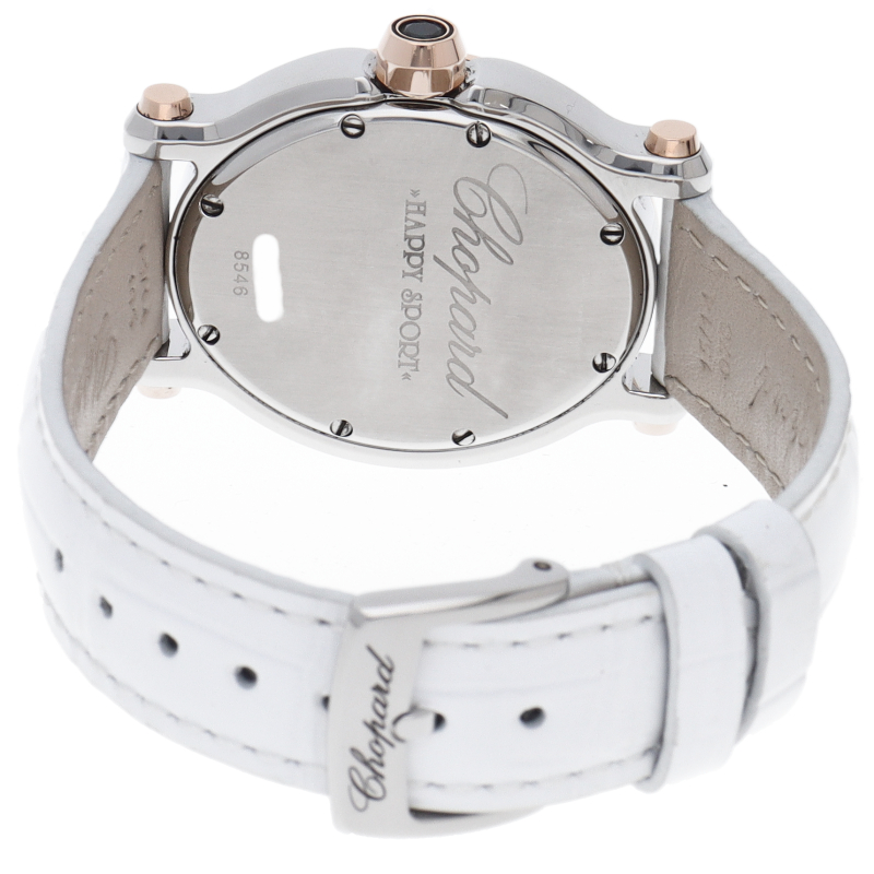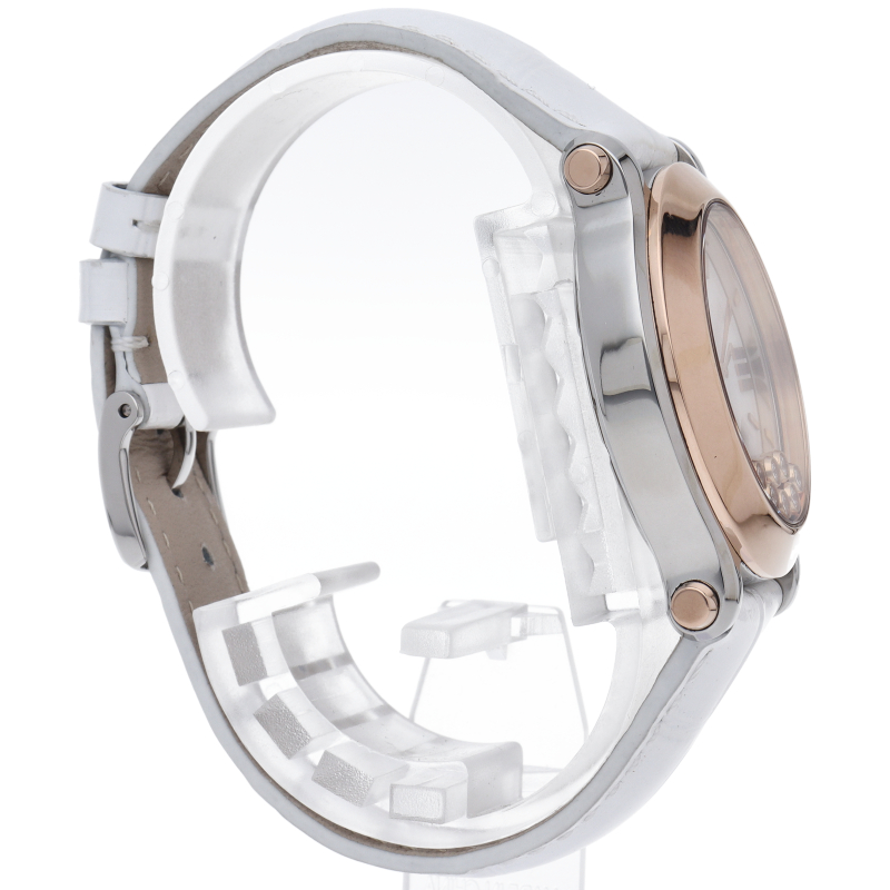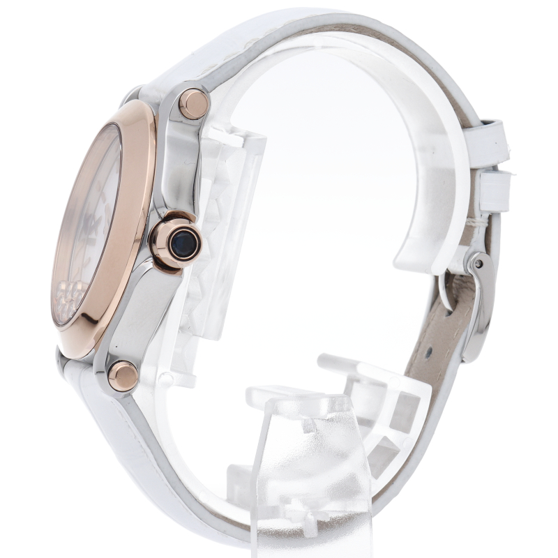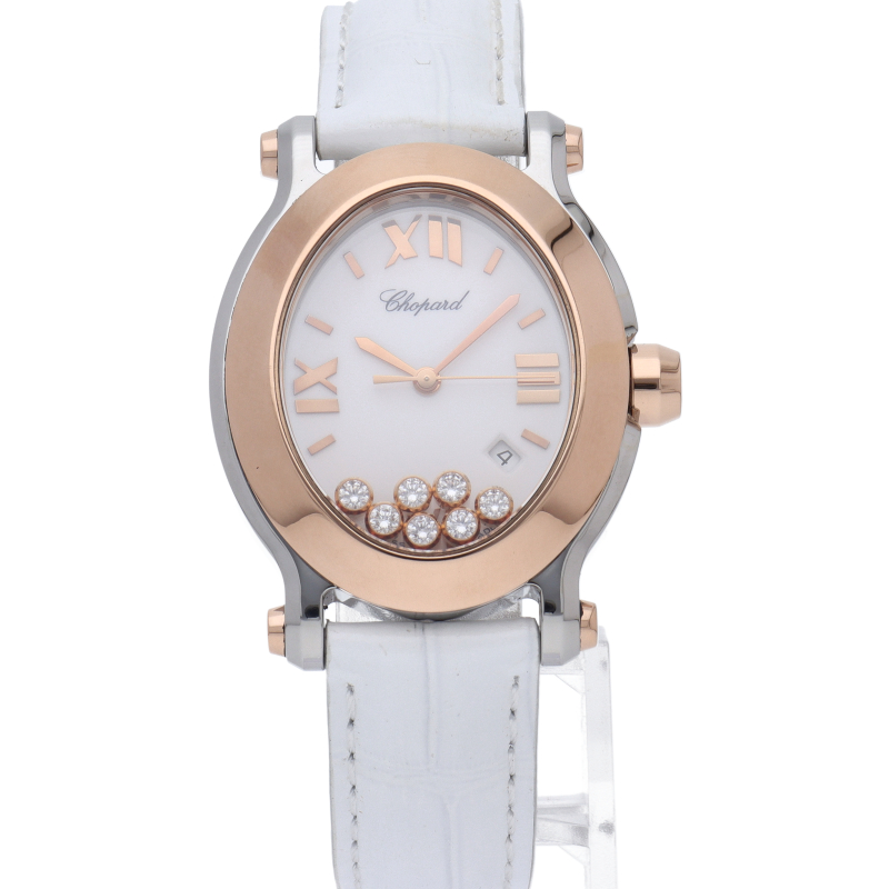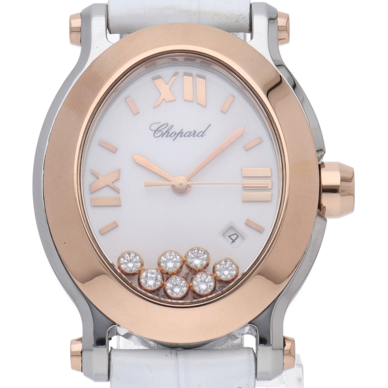 女性の憧れの人気ブランド「ショパール」。文字盤の上をクルクルと動き回るダイヤが特徴的なハッピースポーツ。オーバル型のケースとラグのデザインがクラシカルな印象で、ローズゴールドとステンレススチールの組み合わせも非常に上品な雰囲気です。