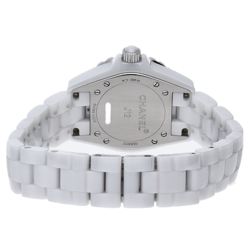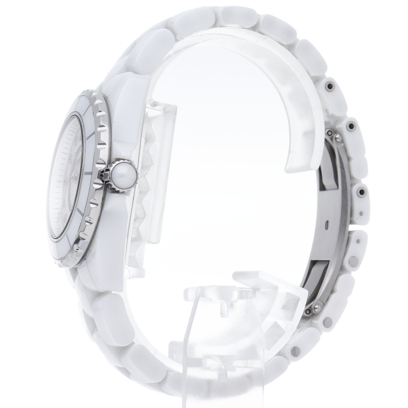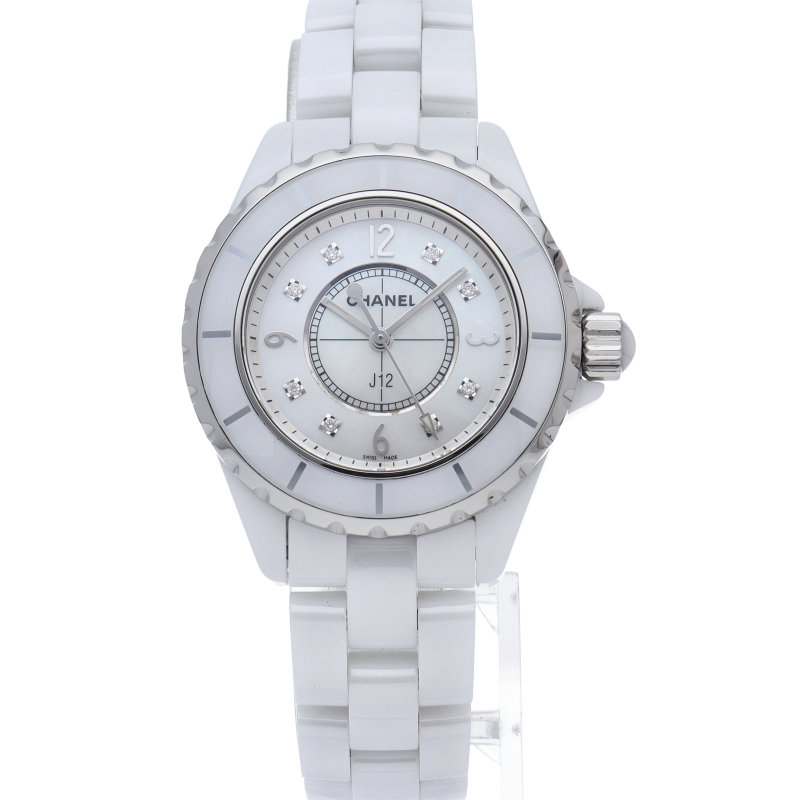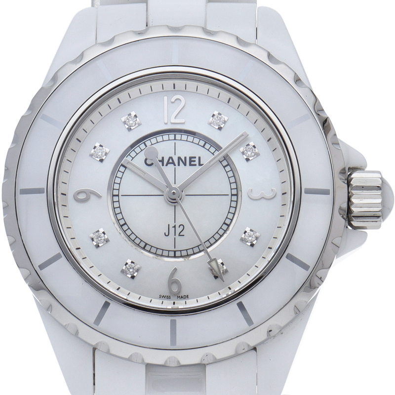 シャネルの人気フラッグシップウォッチで「J12」。異素材で傷がつきにくく独特な光沢感をもつセラミックを使用。こちらはホワイトシェルダイヤルに8Pダイヤモンドを配したラグジュアリーなモデルです。