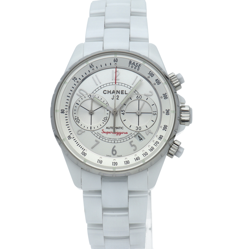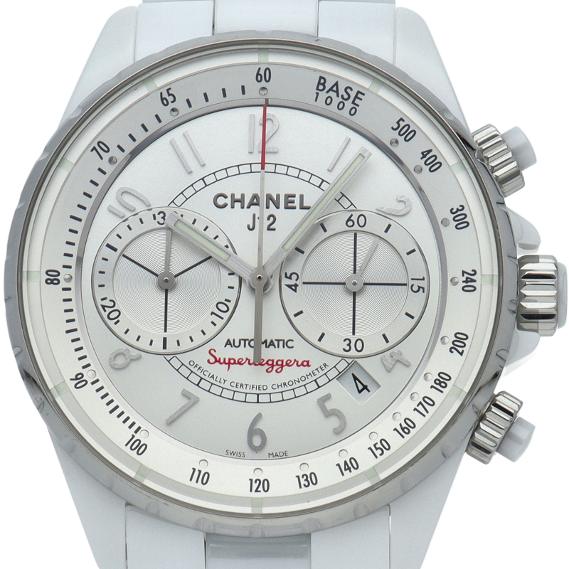 シャネルからスポーティーな雰囲気が人気の『J12 スーパーレッジェーラ』。イタリア語で『超軽量』を意味しスッキリした印象のインダイヤルが2カウンター、ベゼルを無くしタキメーターを内側に納めたお勧めの逸品です。
