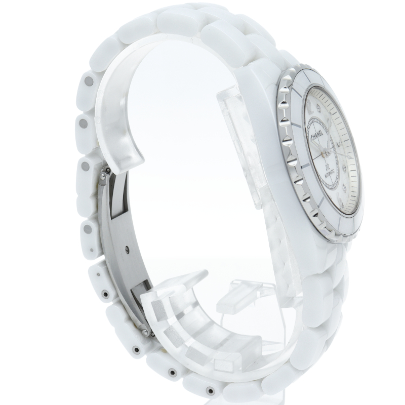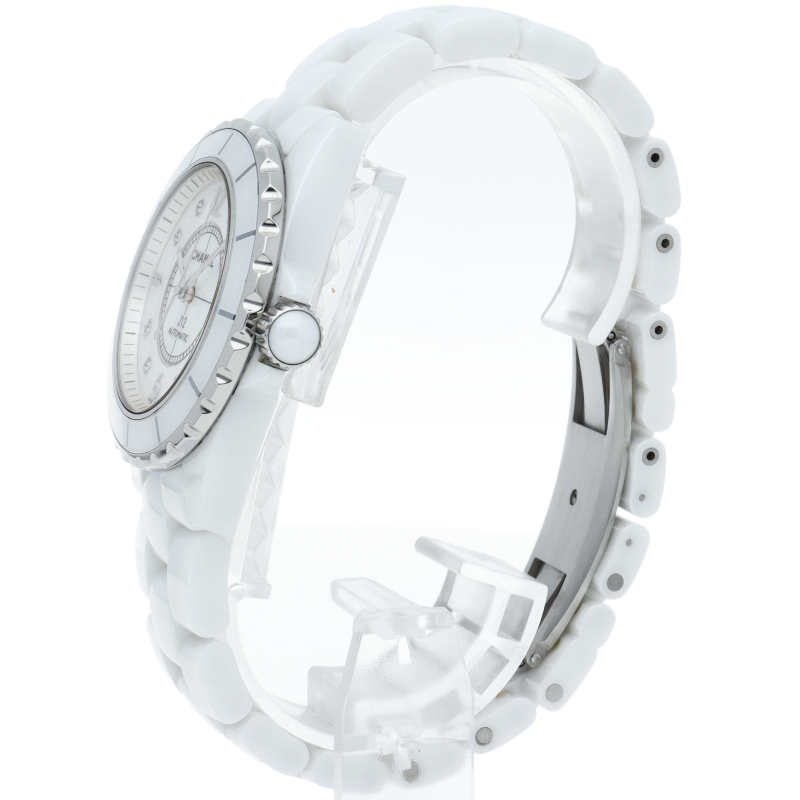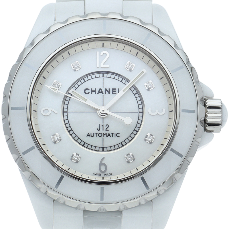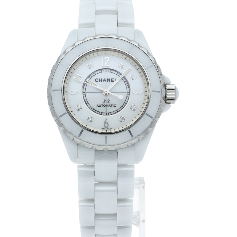 シャネルの人気フラッグシップウォッチで「J12」。異素材で傷がつきにくく独特な光沢感をもつセラミックを使用。こちらはホワイトシェルダイヤルに8Pダイヤモンドを配したラグジュアリーなモデルです。