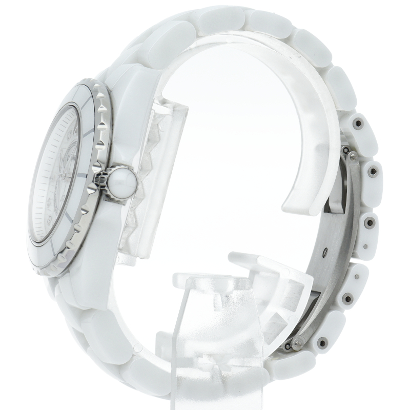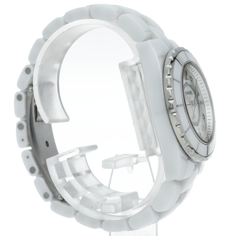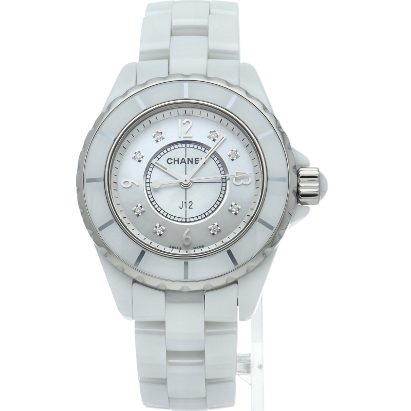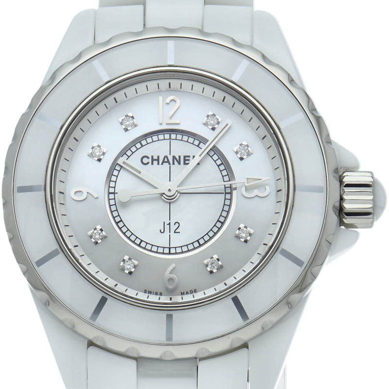 シャネルの人気フラッグシップウォッチで「J12」。異素材で傷がつきにくく独特な光沢感をもつセラミックを使用。こちらはホワイトシェルダイヤルに8Pダイヤモンドを配したラグジュアリーなモデルです。