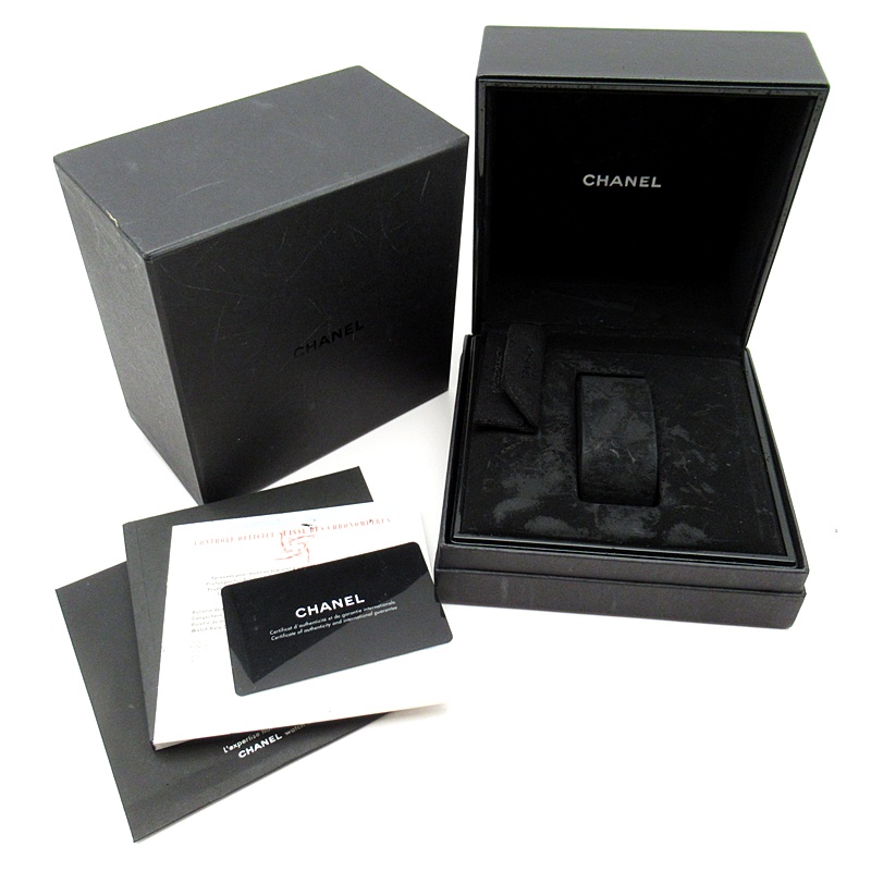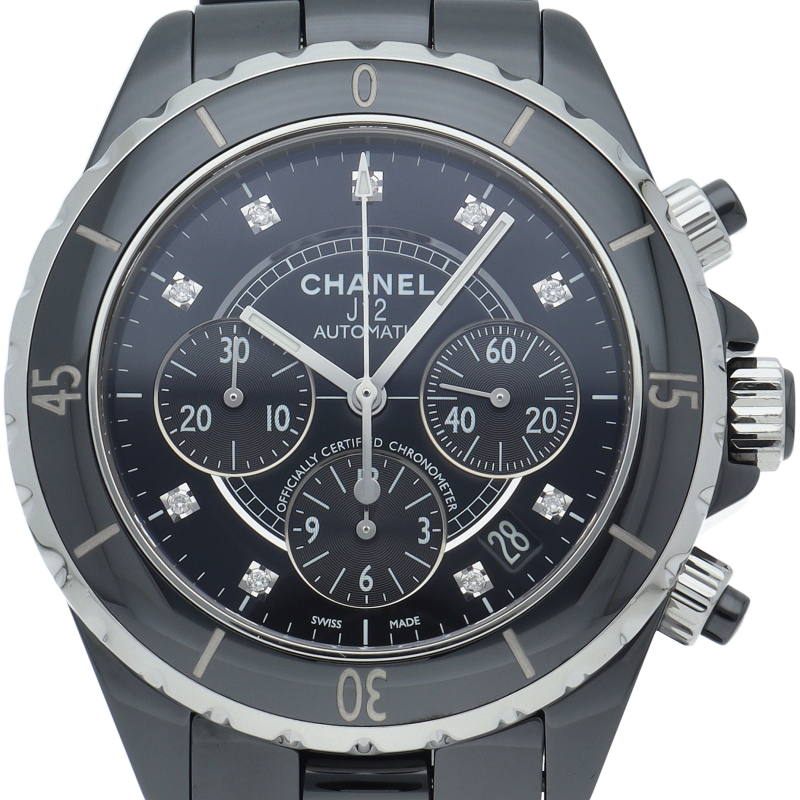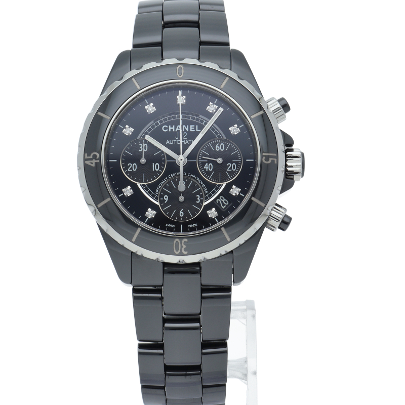 シャネルの人気フラッグシップウォッチで「J12」。異素材で傷がつきにくく独特な光沢感をもつセラミックをうまくデザインに融合させた1本。9Pダイヤが文字盤をひきたてます。クロノグラフ搭載。