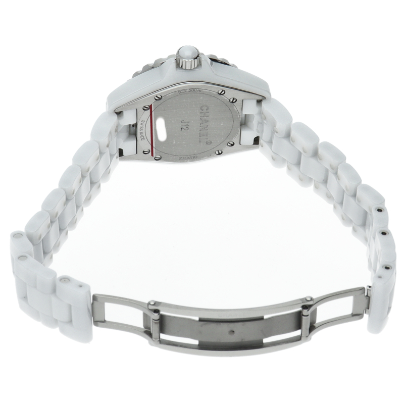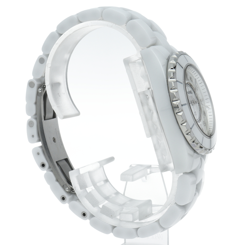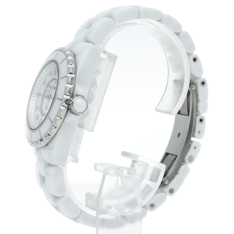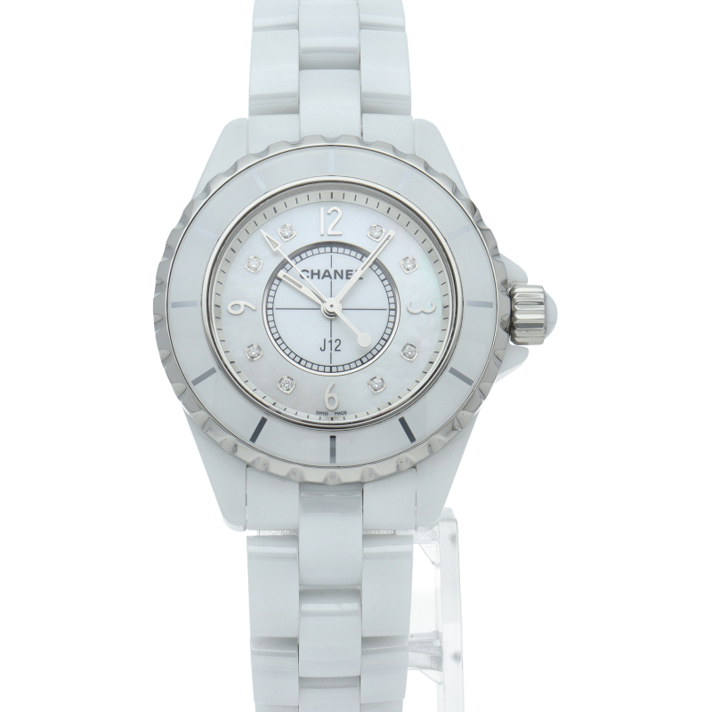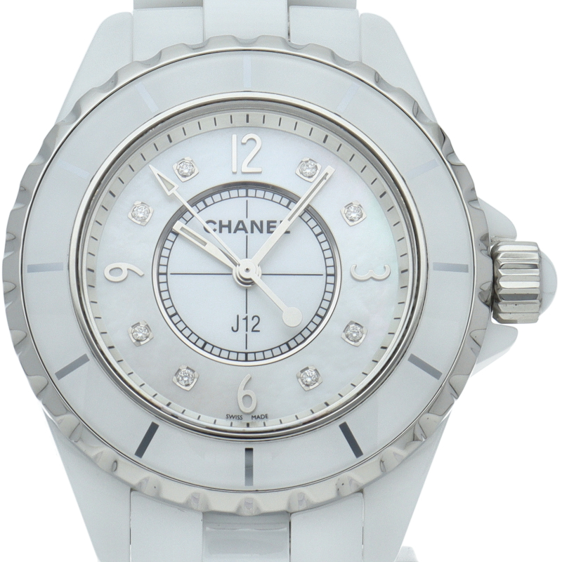 シャネルの人気フラッグシップウォッチで「J12」。異素材で傷がつきにくく独特な光沢感をもつセラミックを使用。こちらはホワイトシェルダイヤルに8Pダイヤモンドを配したラグジュアリーなモデルです。