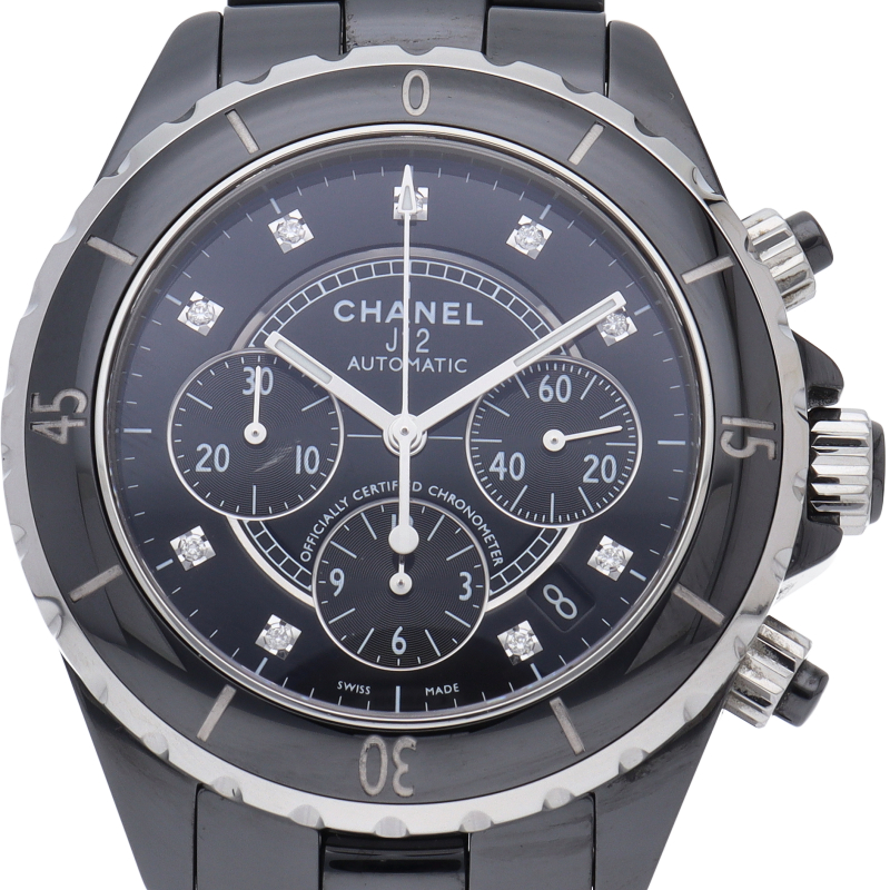シャネルの人気フラッグシップウォッチで「J12」。異素材で傷がつきにくく独特な光沢感をもつセラミックをうまくデザインに融合させた1本。9Pダイヤが文字盤をひきたてます。クロノグラフ搭載。