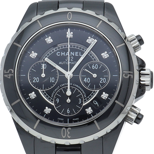 シャネルの人気フラッグシップウォッチで「J12」。異素材で傷がつきにくく独特な光沢感をもつセラミックをうまくデザインに融合させた1本。9Pダイヤが文字盤をひきたてます。クロノグラフ搭載。