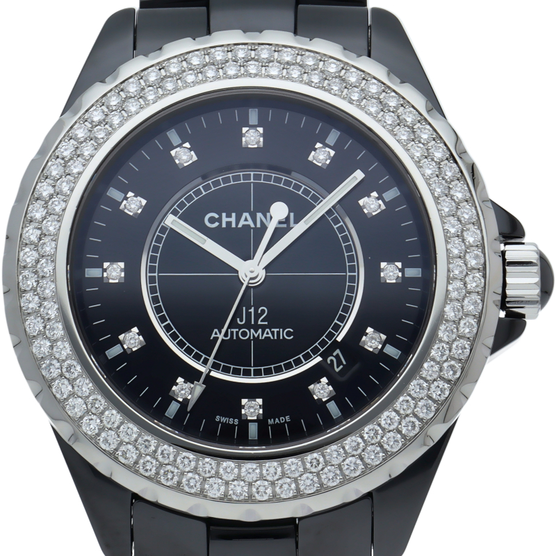 シャネルの人気フラッグシップウォッチで「J12」。42ミリにサイズアップされたケースにベゼル・文字盤にダイヤモンドが施された大変豪華な1本。