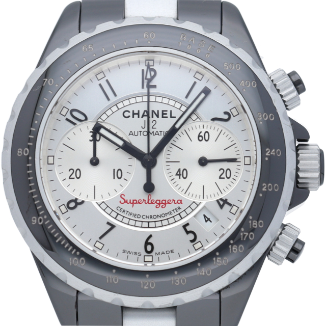 シャネルのフラッグシップウォッチJ12。セラミックにアルミニウムを取り入れたデザインで人気のスーパーレッジェーラです。クロノグラフ搭載。